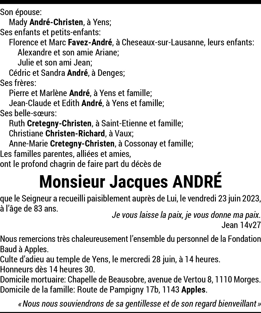 27.06.2023 Melden Chère famille, en pensées avec vous en ces moments pénibles et sincères condoléances. Von Chappuis
