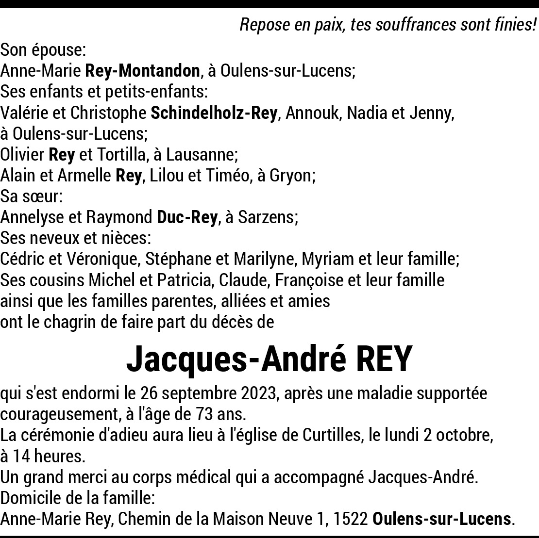 Chère famille, c'est avec tristesse que nous avons appris la nouvelle. Nous sommes en pensées avec vous en ces moments pénibles et sincères condoléances.
