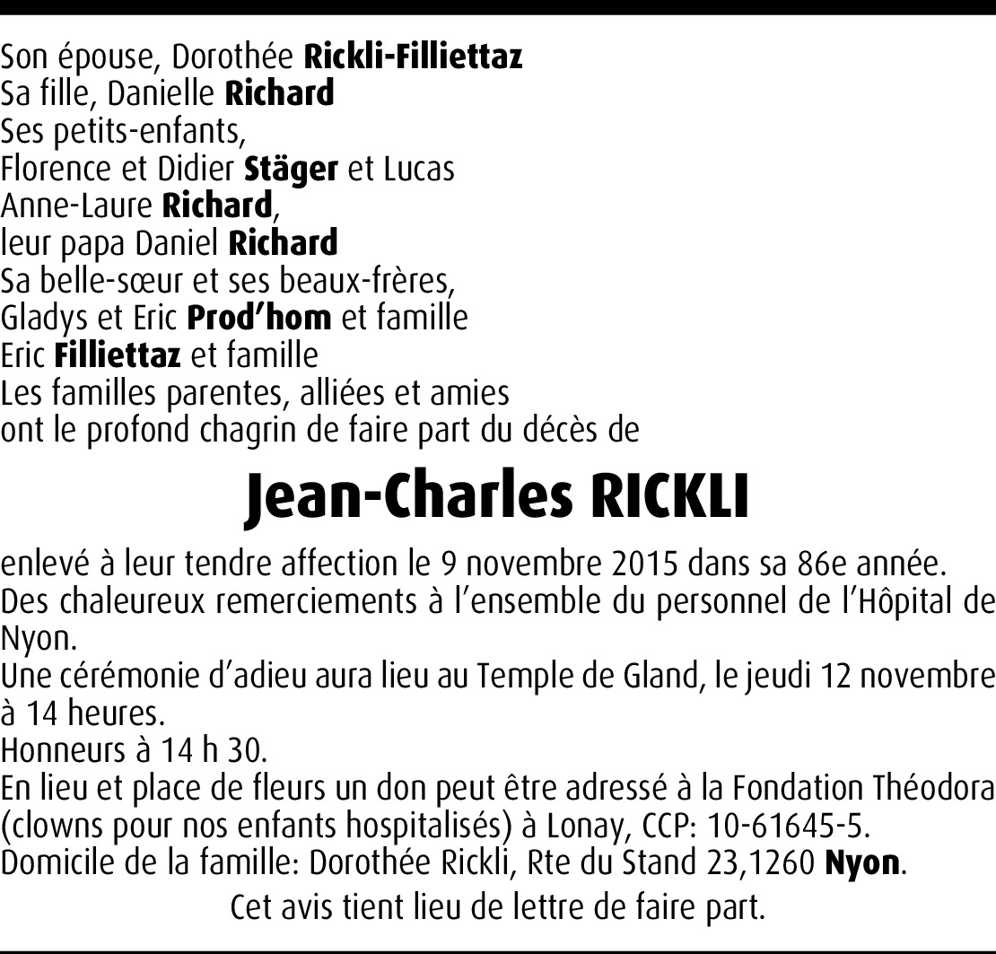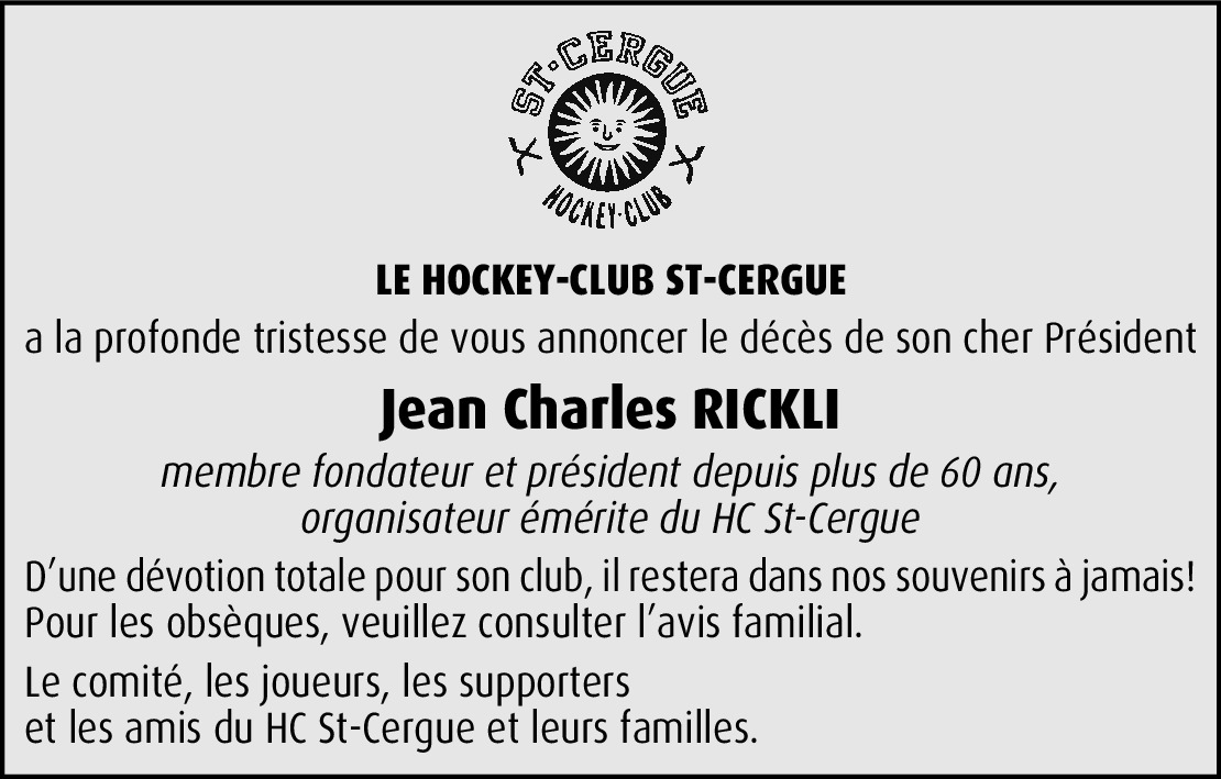 C'est avec une grande tristesse que je viens d'apprendre le décès de mon Ami Jean avec qui j'ai eu la chance depuis toute ces années de passer des très bons moments avec le HC St-Cergue et nos rencontres lors des assemblées de la Ligue Romande. Avec mon épouse Joëlle, nous vous présentons nos plus sincères condoléances et nous sommes en pensées avec vous pendant ces moments douloureux.