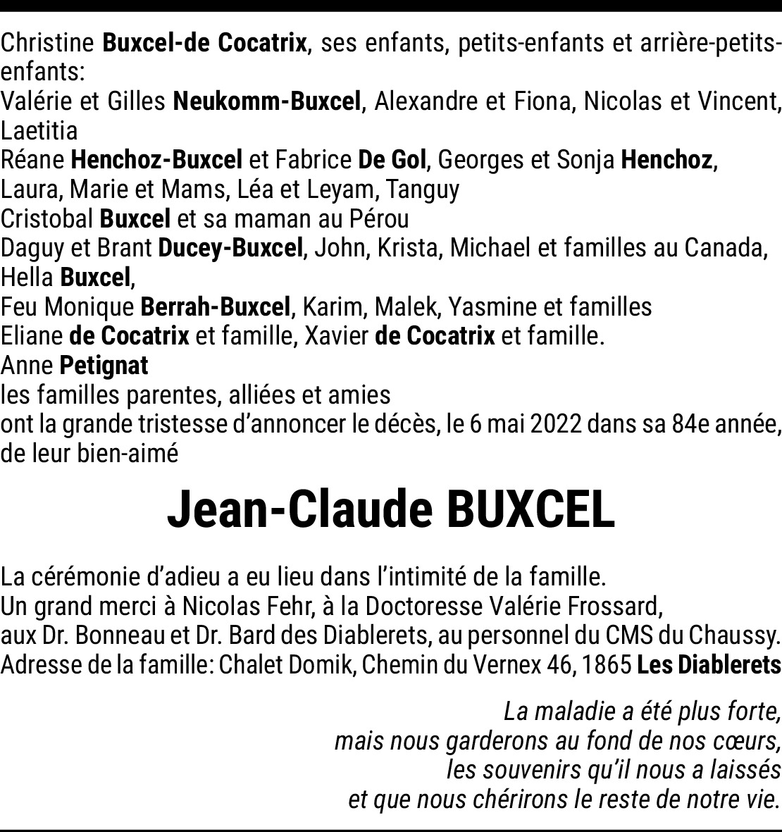 11.05.2022 Melden Chère famille , nous sommes peinés d apprendre le décès de Jean-Claude dont nous garderons un bon souvenir. Nous vous présentons notre sincère sympathie et toute notre amitié. Anne-Marie et Philippe Fontana Von Fontana