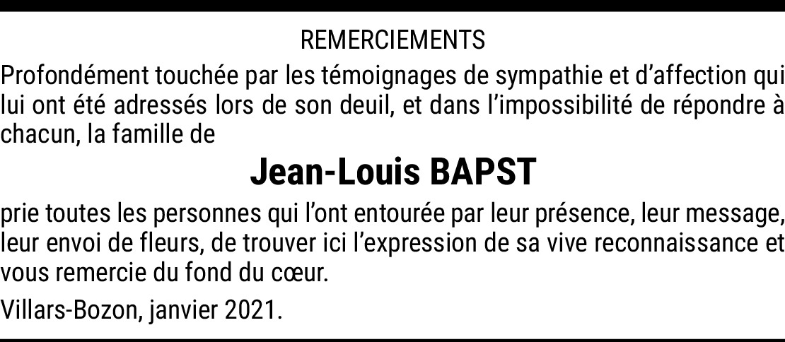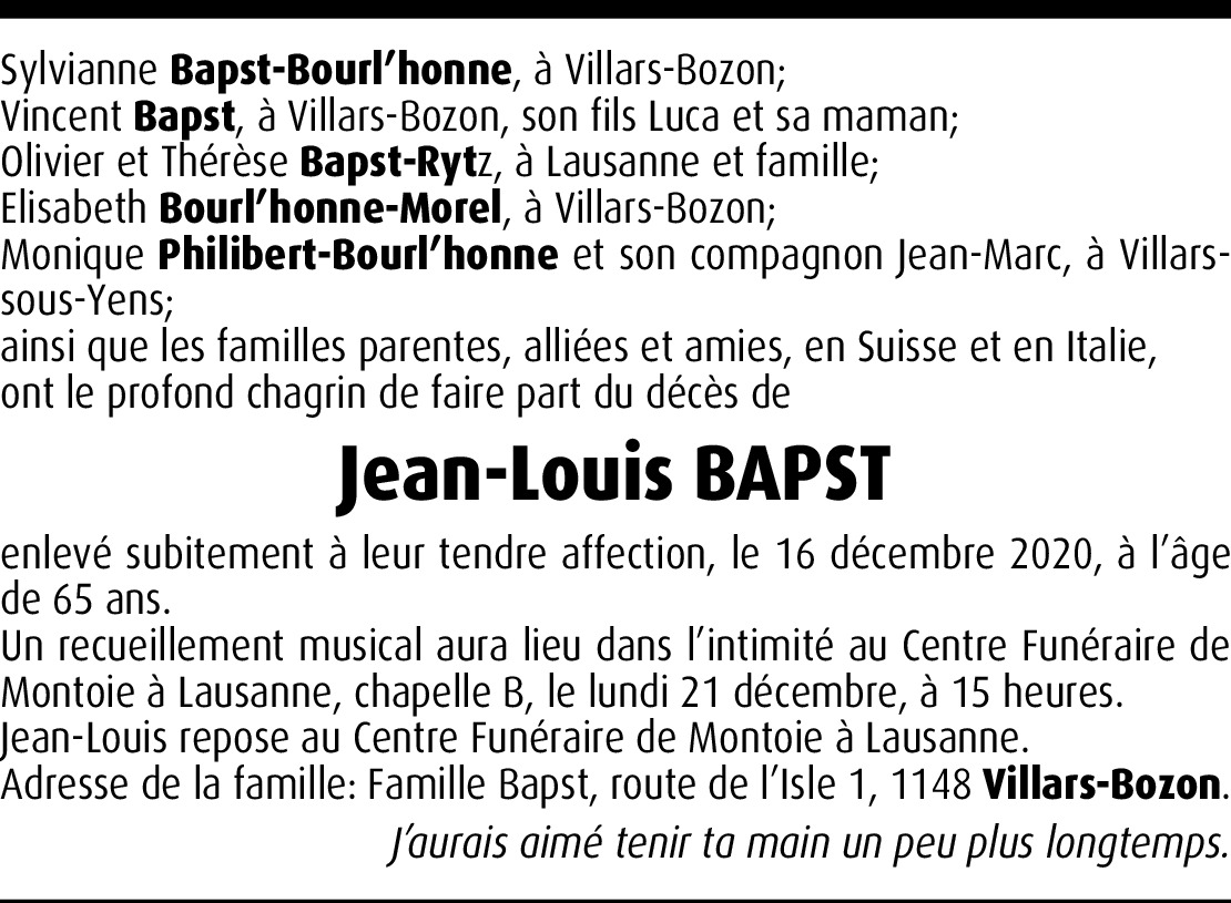 Vor mehr als 4 Jahren Melden Chère famille Jean-Louis est parti sans bruit nous laissant anéanti Je ne trouve pas les mots. De tout cœur recevez mes plus sincères condoléances Céleste la maman de Flavio qu’il aimait transporter à la Cité Radieuse et à la carrosserie à Bussigny Von Céleste Gagliardi