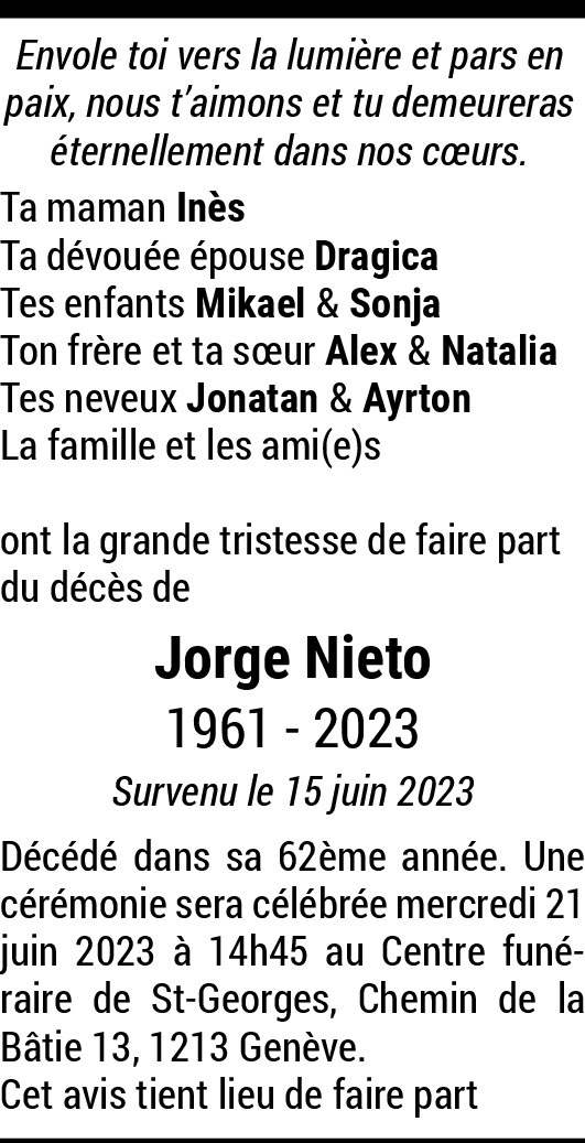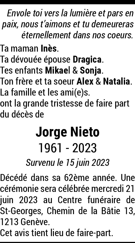 Mon cher ami, Je viens d'apprendre que tu nous a quittés vers un monde meilleur entouré d'une douce lumière. J'ai eu le plaisir de te connaître, toi mon ami d'enfance et de t'avoir revu après tant d'années d'absences. Nous avions évoqué quelques souvenirs et échangé nos N° de natel. Je pense fort à ta femme, tes enfants ainsi qu'à ta maman, ton frère et ta sœur qui sont dans une profonde tristesse tout comme moi. Je te salue mon très cher copain d'enfance et que les anges te protègent comme tu le mérites. "À-Dieu" mon pote...