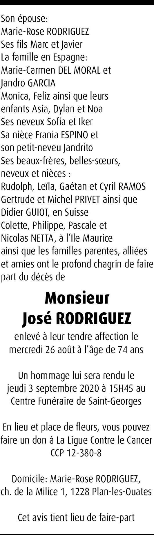Vor mehr als 4 Jahren Melden Perdre un être cher, être séparé d'un des siens, c'est toujours une épreuve qu'il nous est difficile de surmonter, mais saches que nous sommes à tes côtés cousine. Mes sincères condoléances à la famille. De la part de Angélique et Franck Bardot Von Marie Angélique Bardot