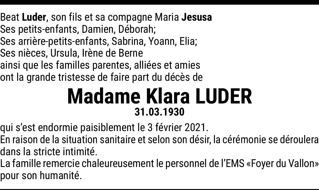 C'est de tout coeur que je suis avec vous tous dans un moment aussi triste, Mme Luder resteras toujours dans mes pensées Bon courage Amitié Marité la coiffeuse