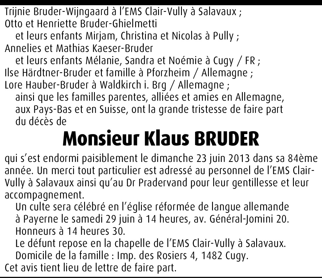 Cher Famille, C'est avec une grande tristesse que j'ai appris le décès de Monsieur Klaus Bruder. Avec émotion je garde le souvenir ému d'un collaborateur (ami) qui m'a soutenu et aidé dans tous les moments difficiles passé au sein de mon entreprise, Monsieur Bruder a été un très fidèle collaborateur qui m'a fait bénéficier de ses grandes compétences et expériences. Ses judicieux conseils m'ont beaucoup appris et aidé face aux décisions cruciales de l'entreprise. Sa loyauté et son intégrités mon accompagné durant plus de 30 ans. Croyez-moi cher famille que le souvenir de votre cher Papa et de votre mari est gravé dans mon coeur. Je vous prie d'accepter ici toute ma sympathie et reconnaissance. Jean-Luc Bossy et famille.