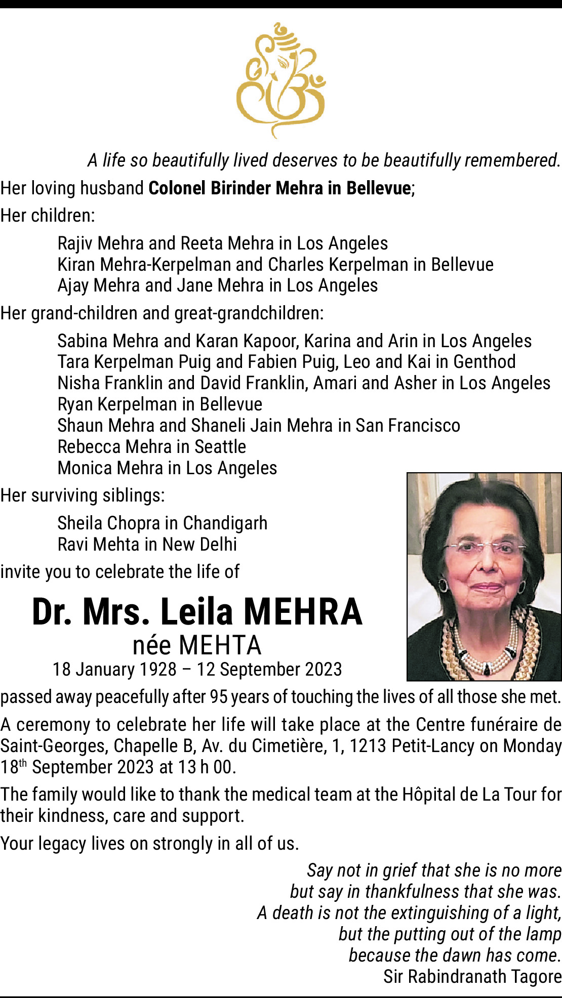 Leil Booaji was the brightest, sharpest & cleverest girl in the Mehta family & she qualified as a doctor & travelled the world at a time few women stepped out. She was classy, elegant always beautifully dressed. Leil Booaji lived her life to the fullest and on her own terms always standing up for what she felt was right. A strong & important pillar of our family she was loving and caring touching all our lives in so many ways. She was a role model for the women in our family to strive towards becoming strong & independent. Being closest for my dad, she represented him for me once my dad was gone. I have many many fond memories of times spent with her and how she always remembered to bring some little gift for me whenever she travelled when I was growing up. We are blessed to have had her in our midst and will forever cherish wonderful memories of her . May she rest in eternal peace … perhaps having tea with her brother Yog and the rest of our elders 💖