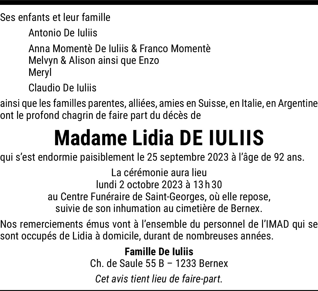 Chère Famille, vous avez eu une Maman, Grand-Maman et arrière Grand-Maman formidable. Vous lui avez démontré votre amour en restant à ses côtés durant toutes ces années. Maintenant il vous reste l’espoir de la revoir grâce à la résurrection (Actes 24:15 ). Recevez toutes mes condoléances et mon amitié.