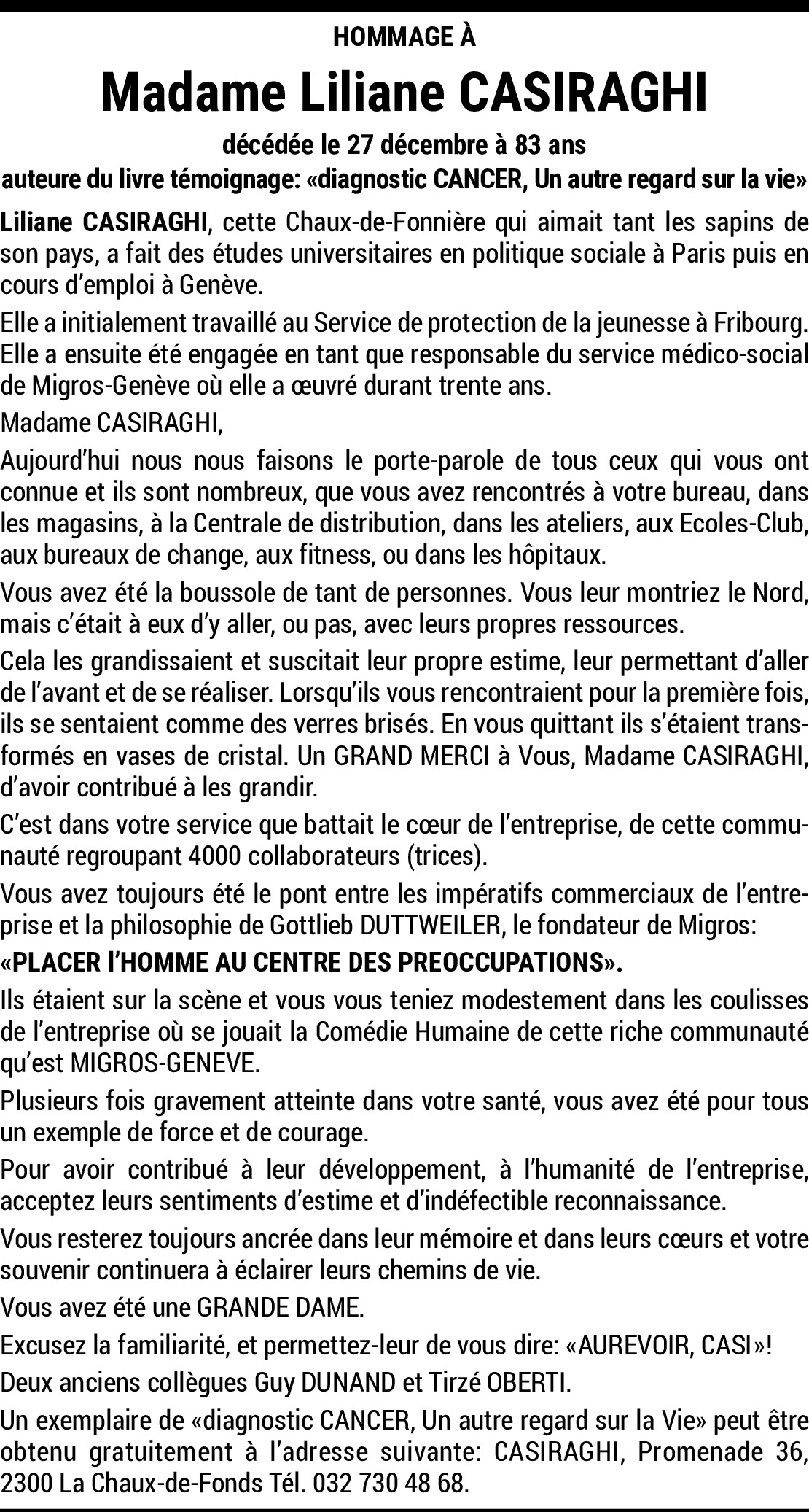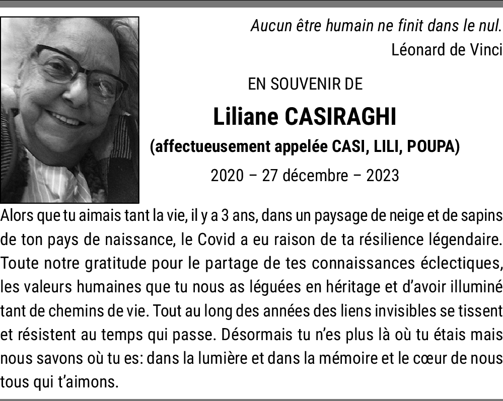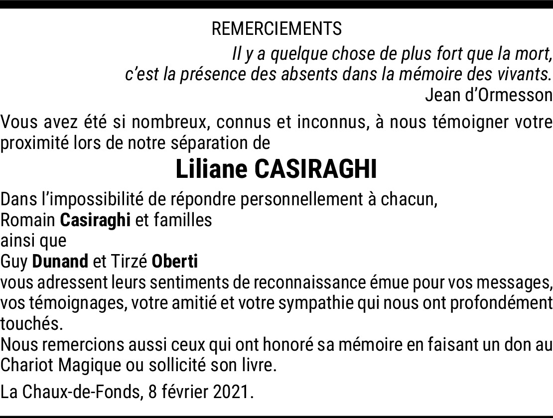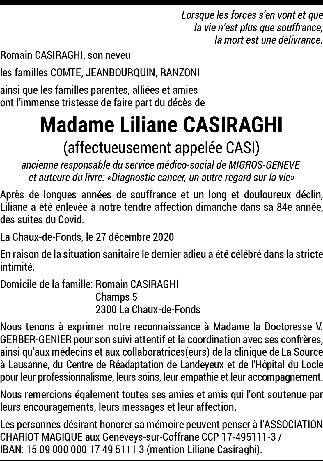 Vor mehr als 4 Jahren Melden L’épreuve qui bouleverse votre famille me peine. Je tiens à vous exprimer, dans ces moments de grande tristesse, mes plus sincères condoléances. Casi restera toujours dans nos cœurs. Soyez assuré de ma chaleureuse sympathie. Arnold Schenk Von