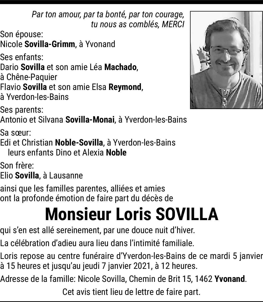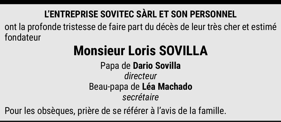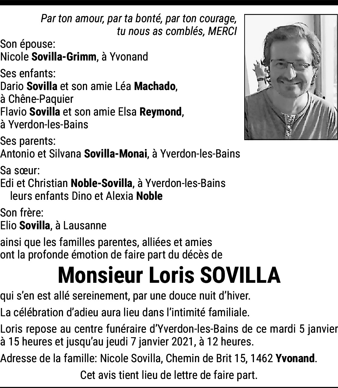 Loris, avec sa sympathie et son sourire, sera pour toujours un très beau souvenir de ma jeunesse à Orbe. De l'Italie j'envoie mes condoléances à toute la famille. Cinzia, petite-fille de Monsieur et Madame Perolini