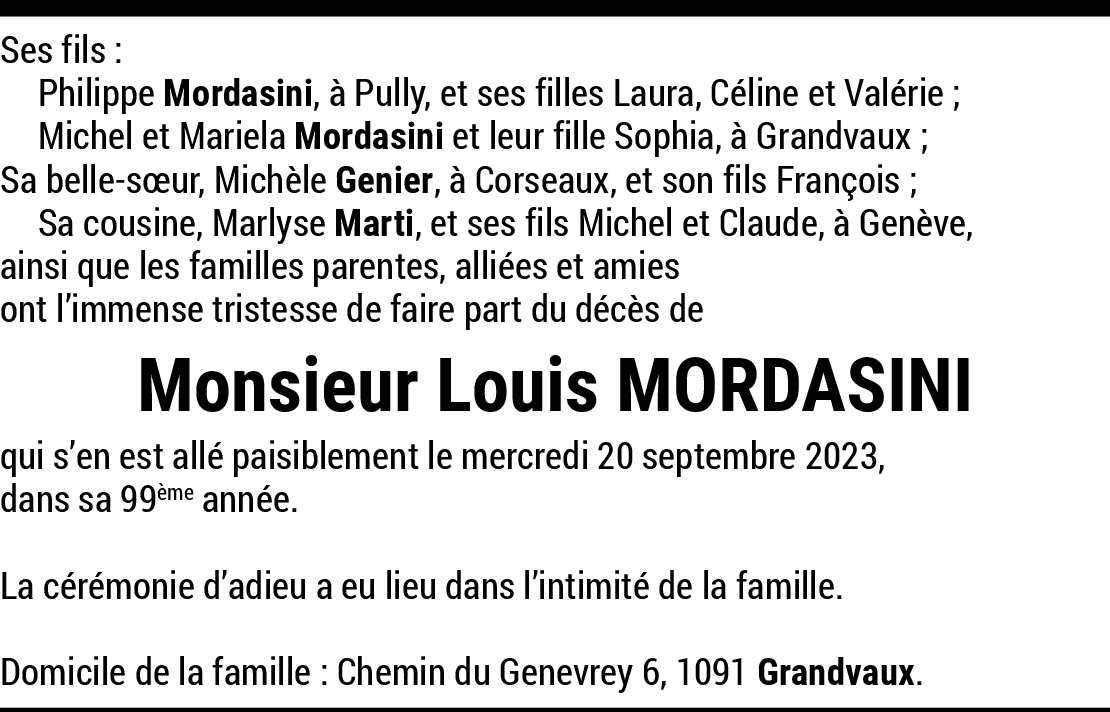 Avec toute notre sympathie lors du départ de votre bien-aimé Papa et mon ex collègue de travail Louis MORDASINI. R.I.P. La cérémonie était touchante, je vous en remercie. Regina BEUTLER, Chailly-Lausanne, Christophe BUCHARD, Montherod et Sébastien BUCHARD, La Conversion. 💐