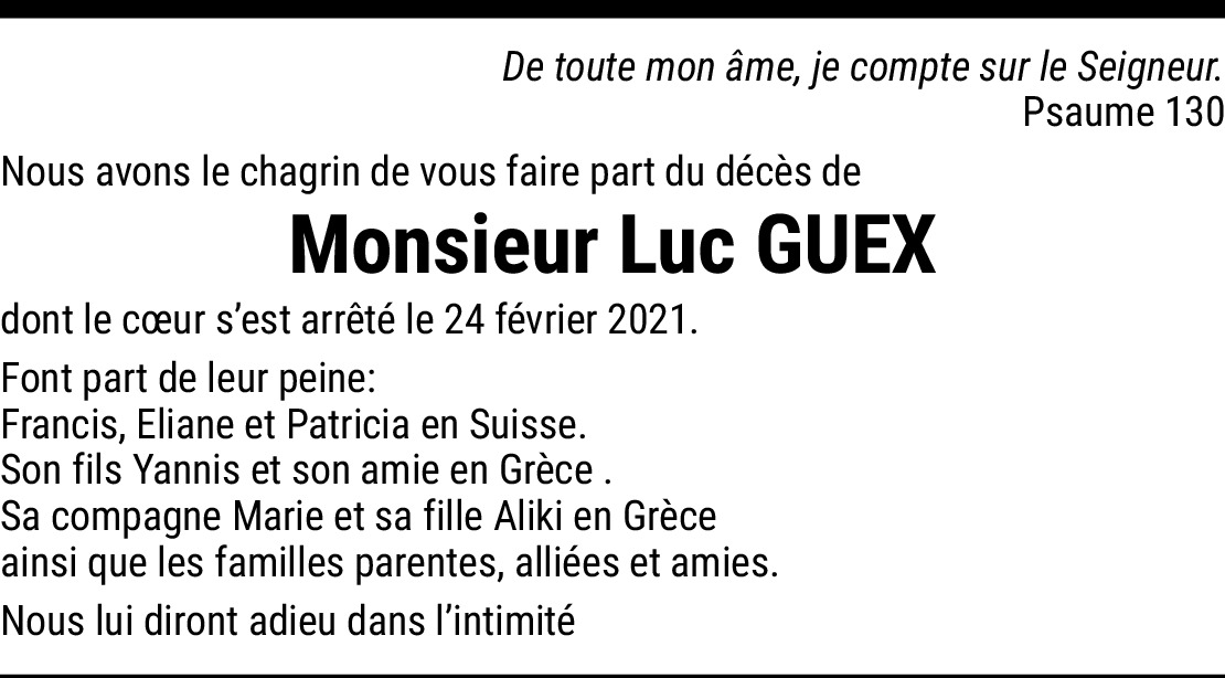 A toute la famille Guex en Suisse et en Grèce, C'est avec grande tristesse que nous avons appris le décès de Luc, mon ami de l'Ecole des Métiers et de belles journées passées en famille à Mollie-Margot. Bien que nos chemins nous aient conduits sur des continents différents, je repense à tous ces bons moments en sa compagnie et garderai ce souvenir de lui. Nous vous adressons nos plus sincères condoléances dans ces instants douloureux. Que Dieu vous bénisse et vous réconforte. En pensée avec vous. Olivier & Susan Brack E-mail: [email protected] Atlanta, Georgia (GA), USA