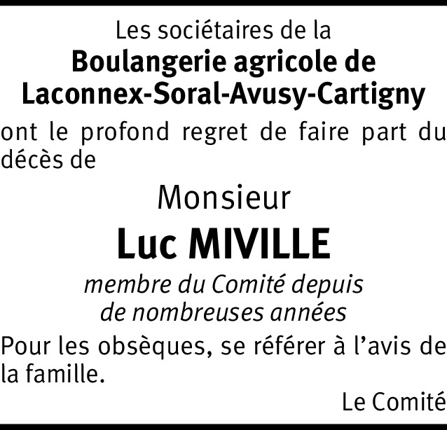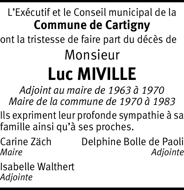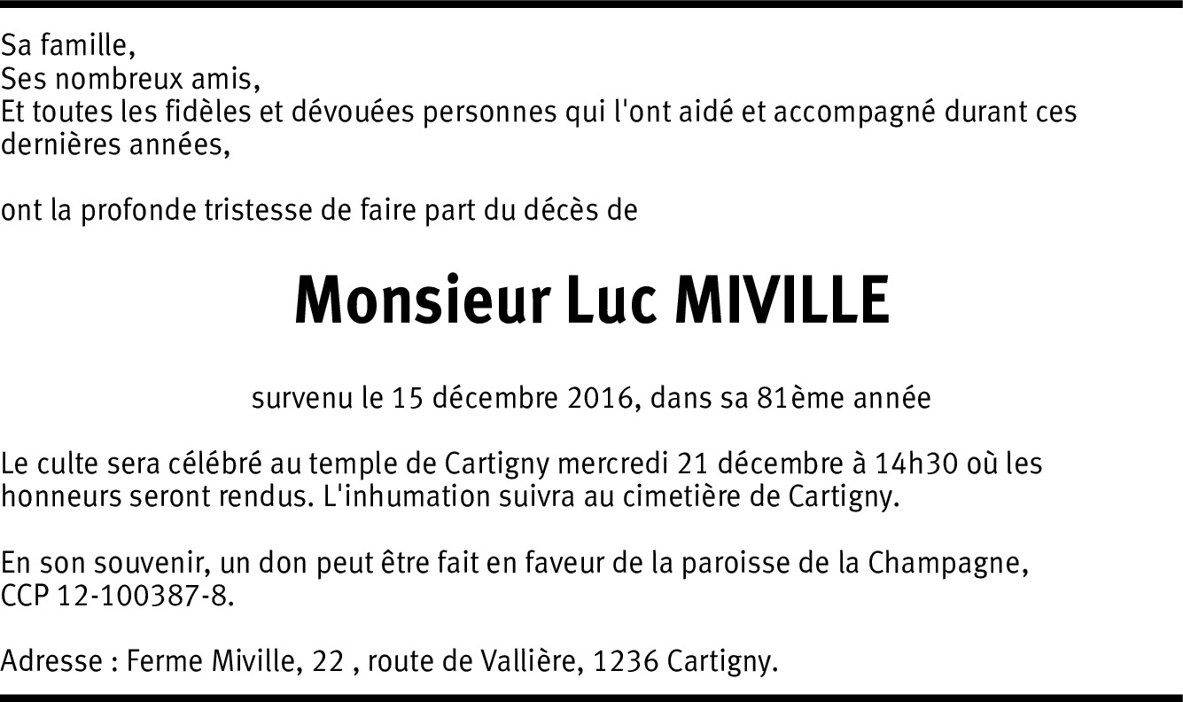 Luc Miville aura été pour moi l’une des personnes les plus importantes de mon enfance si ce n’est la plus importante. Nous étions voisins et il m’a tout appris sur la nature, les animaux de ferme, les semences, les récoltes, etc. et le respect de la nature. Chaque fois que c’était possible, nous l’accompagnions sur son tracteur, dans les champs, au poulailler, dans la pièce où il faisait boucherie. C’était un grand homme, d’une immense gentillesse et d’une générosité sans égal. J’ai un souvenir très ému de ces nombreuses années passées à proximité de «la ferme de Luc» à Cartigny. Je transmets à sa famille toute ma sympathie et mes condoléances.