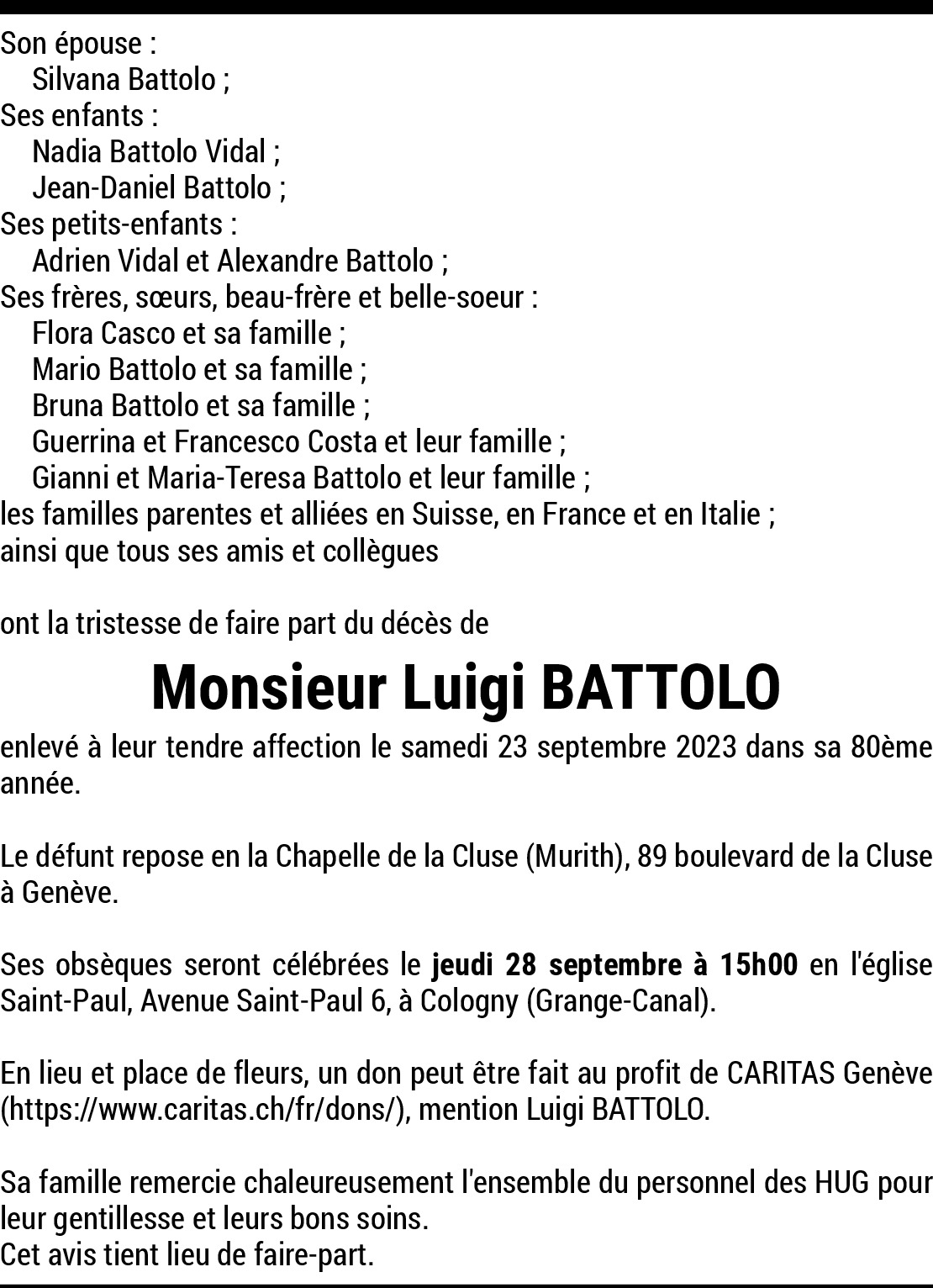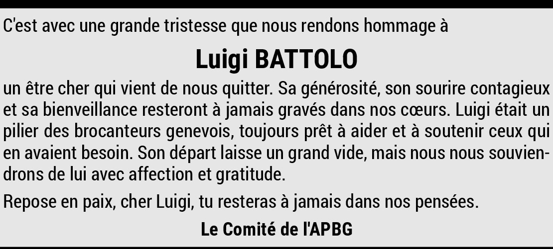 Chère Nadia et cher Jean-Daniel, c'est avec tristesse que j'apprend le décès de Luigi. Sa passion pour la brocante et antiquité l'aura suivi toute sa vie. Un personnage incroyable qui aura marqué à tout jamais par sa présence le marché aux puces de Plainpalais. Je garde un bon souvenir de lui qui a toujours été bien veillant envers moi. Je suis de tout cœur avec vous et votre maman dans ces moments si difficiles.