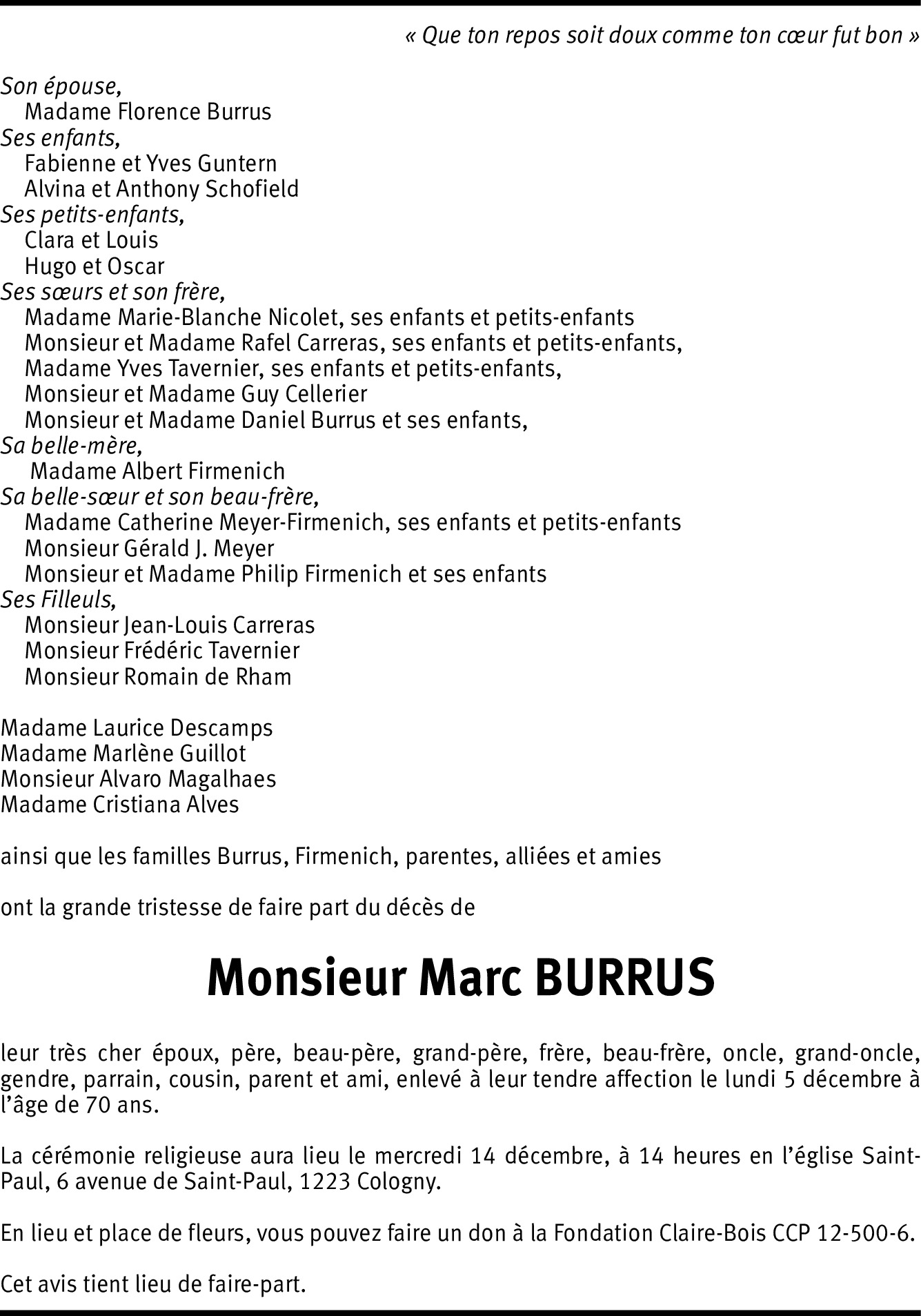 Chère Florence et Famille.