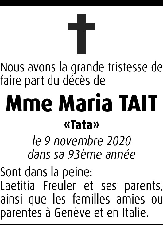 Merci Tata pour ces 32 années durant lesquelles tu as toujours été à nos cotés, dans les bons et les mauvais moments. Merci d'avoir pris soin de notre fille Laetitia comme si elle était la tienne. Tu n'as pas eu le bonheur d'être maman, mais tu as offert plein d'affection et de joie à beaucoup d'enfants durant ta vie. Merci pour ta disponibilité et ton aide à chaque fois que cela était nécessaire. Merci pour ta bonne humeur et les fous rires qu'on a eu ensemble. Merci pour l'acceptation et l'affection que tu as toujours témoigné à nos nombreux animaux. Merci pour tes prières quotidiennes pour demander, surtout à Padre Pio, de veiller sur nous; à présent, à notre tour de lui demander de t'accompagner et te guider sur ce nouveau chemin. Melinda et Léo