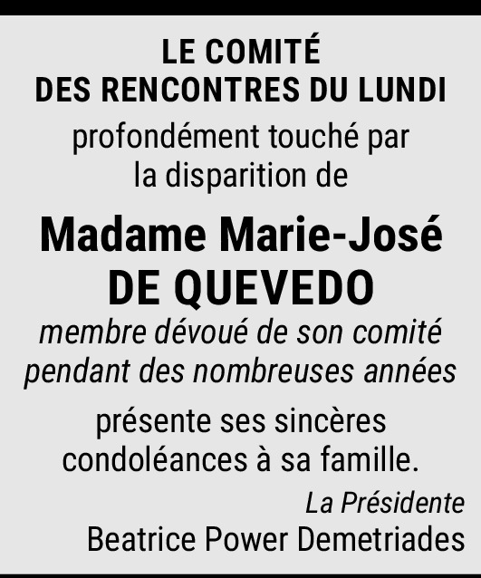 Pendant de nombreuses années Marie José a fait partie du Comité des Rencontres du Lundi auquel elle a participé avec un enthousiasme remarquable et apportant sa touche personnelle toujours appréciée et utile. Sa noblesse de cœur et d'esprit, sa culture et sa gentillesse ont beaucoup enrichi les événements de nos Rencontres hebdomadaires.