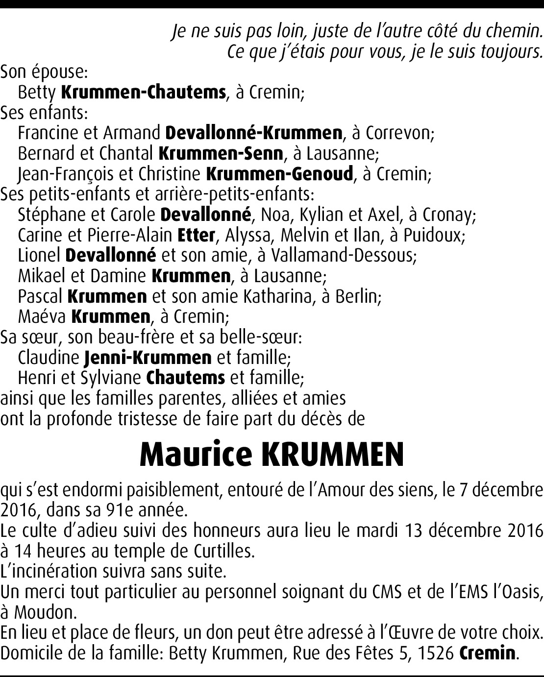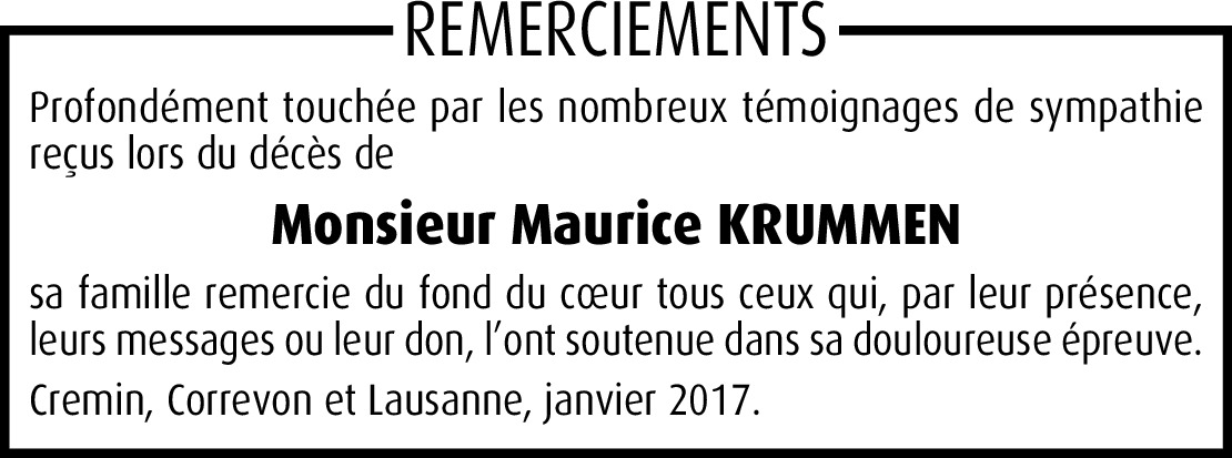 Vor mehr als 4 Jahren Melden Chère Famille, c'est avec tristesse que nous avons appris la nouvelle. Nous sommes en pensées avec vous en ces moments pénibles et vous présentons nos sincères condoléances. Von Jean-François Chappuis