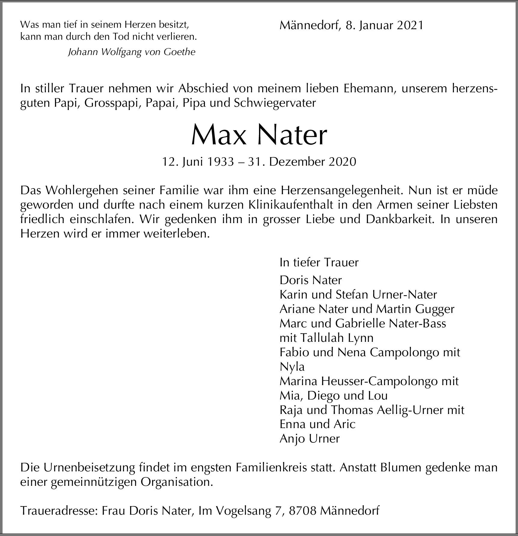 Möchten Sie über neue Todesanzeigen und Kondolenzen für diesen Verstorbenen informiert werden?