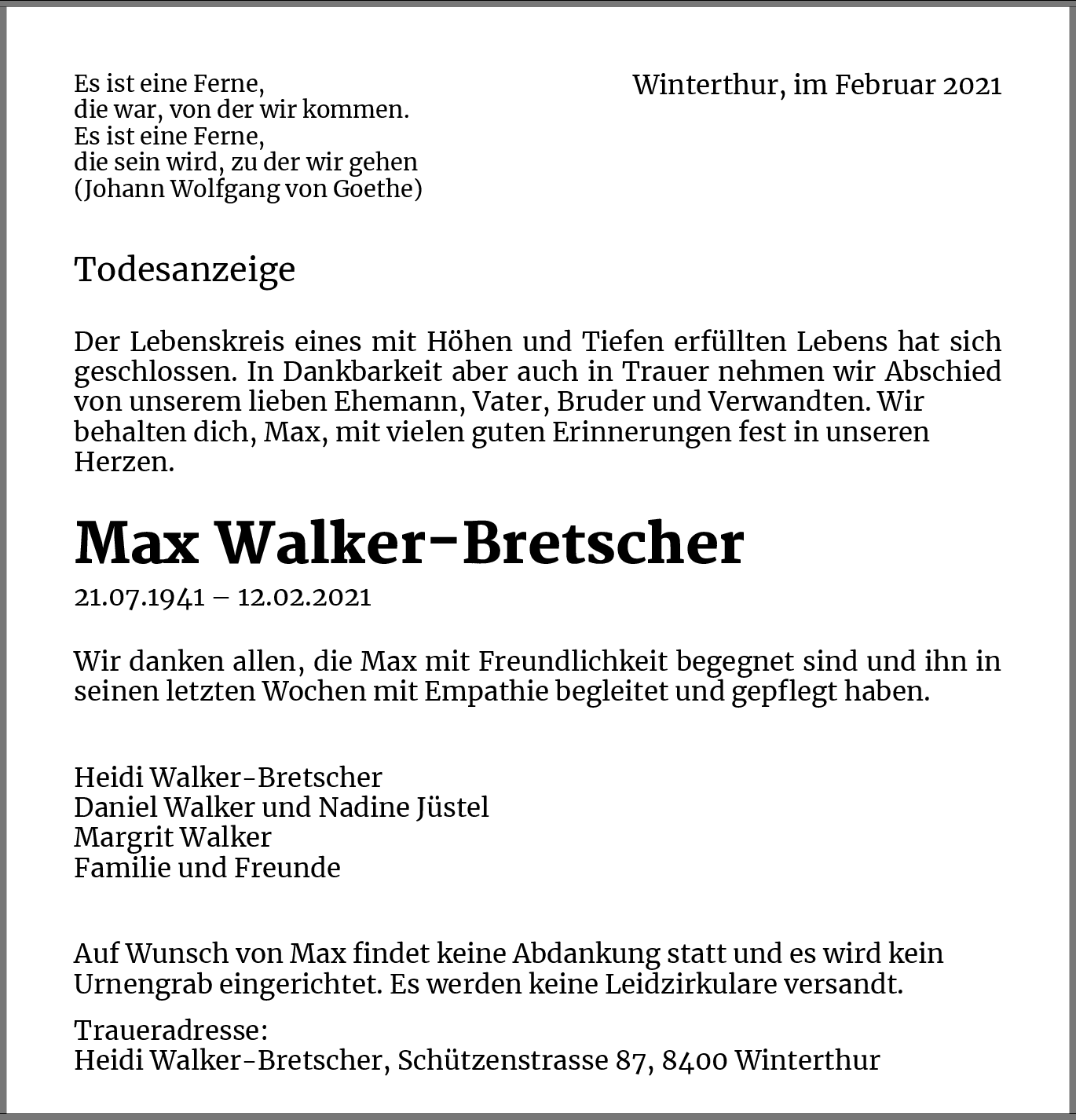 Möchten Sie über neue Todesanzeigen und Kondolenzen für diesen Verstorbenen informiert werden?