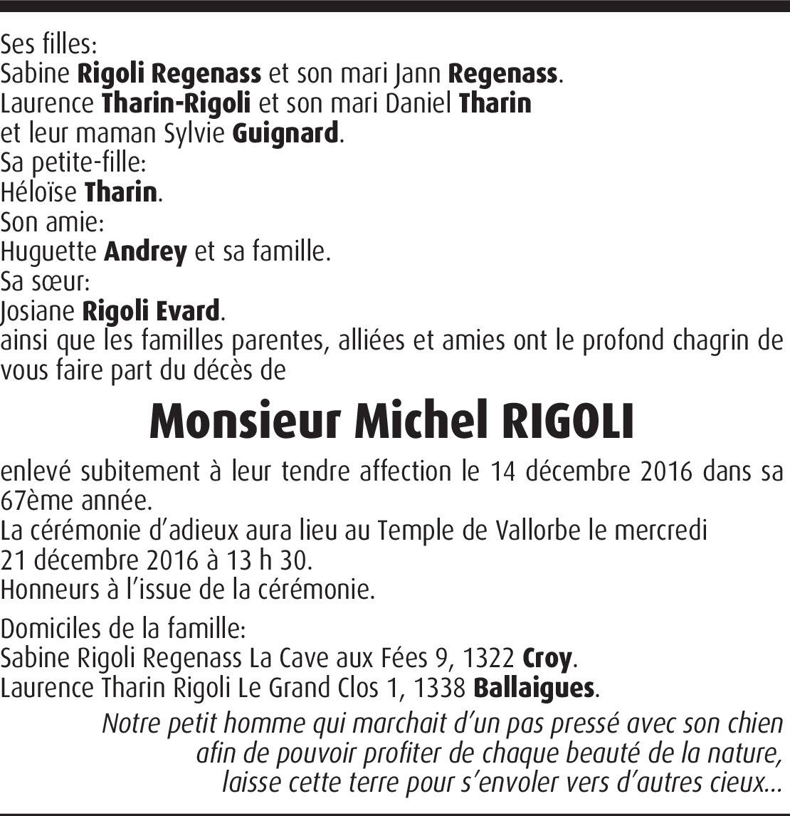 La nouvelle m’est arrivée comme un coup de massue. Il y a un mois à peine, lors d’un passage à Vallorbe, nous faisions un brin de causette avec force éclats de rire et aujourd’hui tu tires ta révérence pour découvrir d’autres contrées. Nous étions petits cousins du côté des Déponds et c’est vrai que nous nous rencontrions peu souvent, mais chaque fois j’avais du plaisir à te voir car tu avais toujours le sourire, comme si tu avais la faculté de tout relativiser. A toute la famille, je tiens à présenter mes sincères condoléances, suis en pensées avec vous.