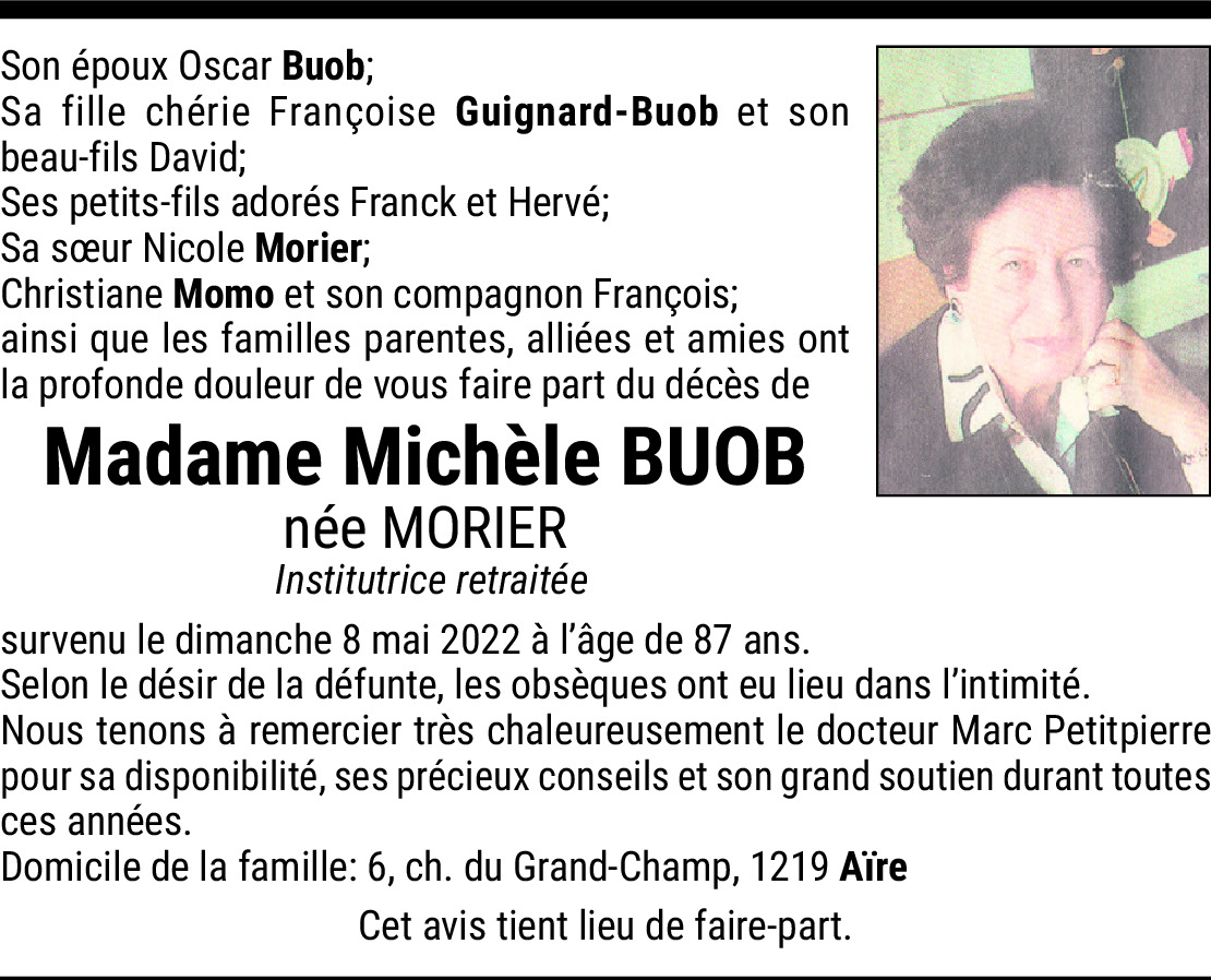 Toute ma sympathie à la famille de Mme Buob, ma première maîtresse d'école à l'Ecole du Seujet et dont je garde, après plus de 40 ans, un bon et émouvant souvenir de sa gentillesse et de son enseignement.