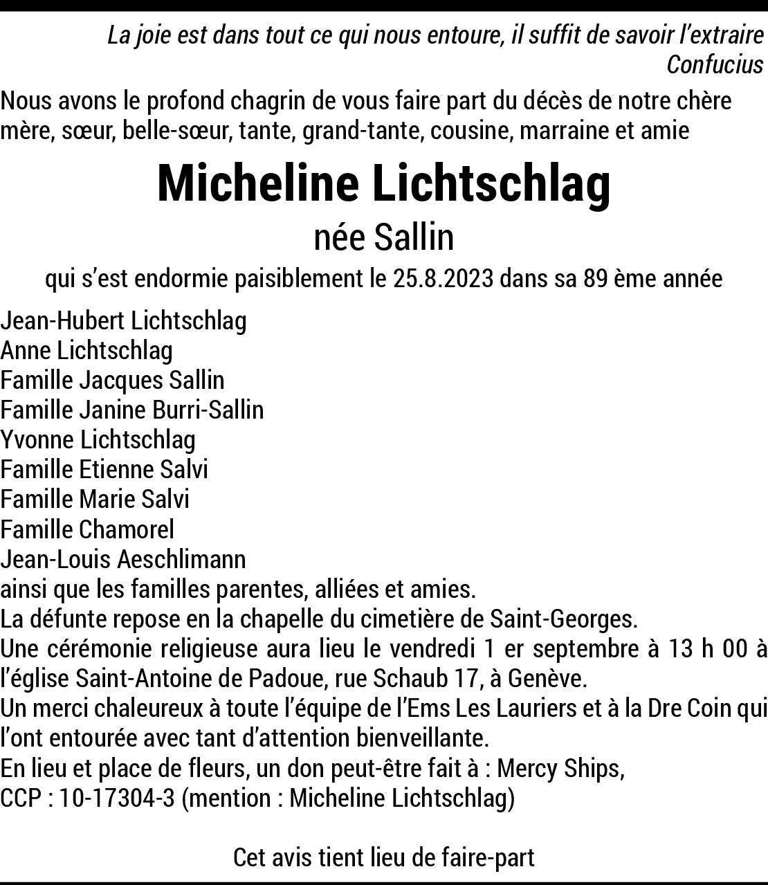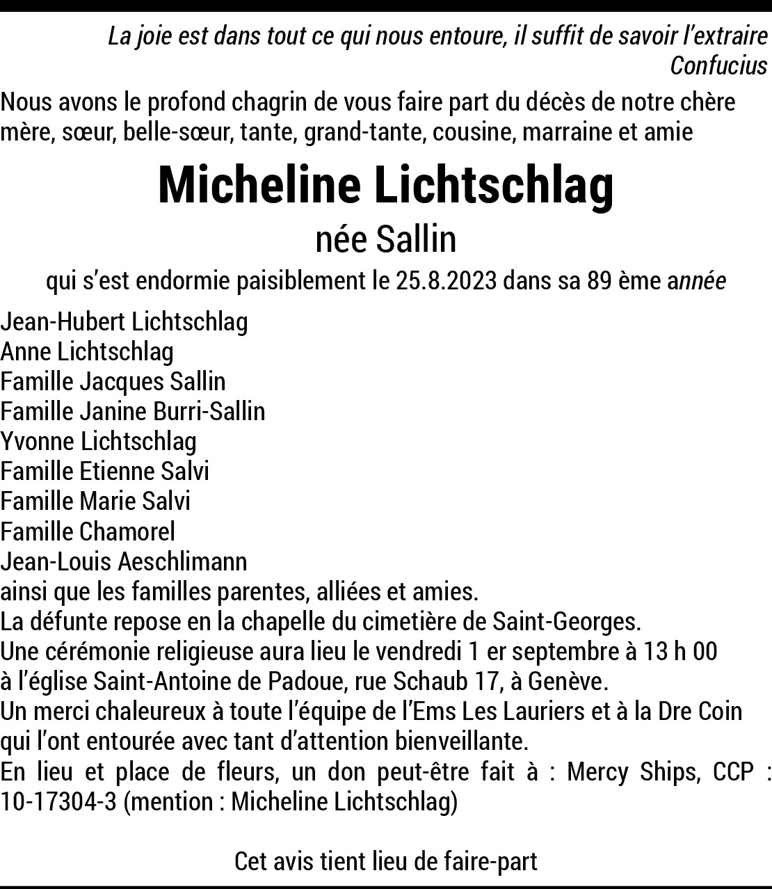 30.08.2023 Melden Cher Jean-Hubert, Toutes mes condoléances à toi et à ta famille. Courage en ces moments difficiles. Je suis avec toi en pensées. Daniel Von Wagner