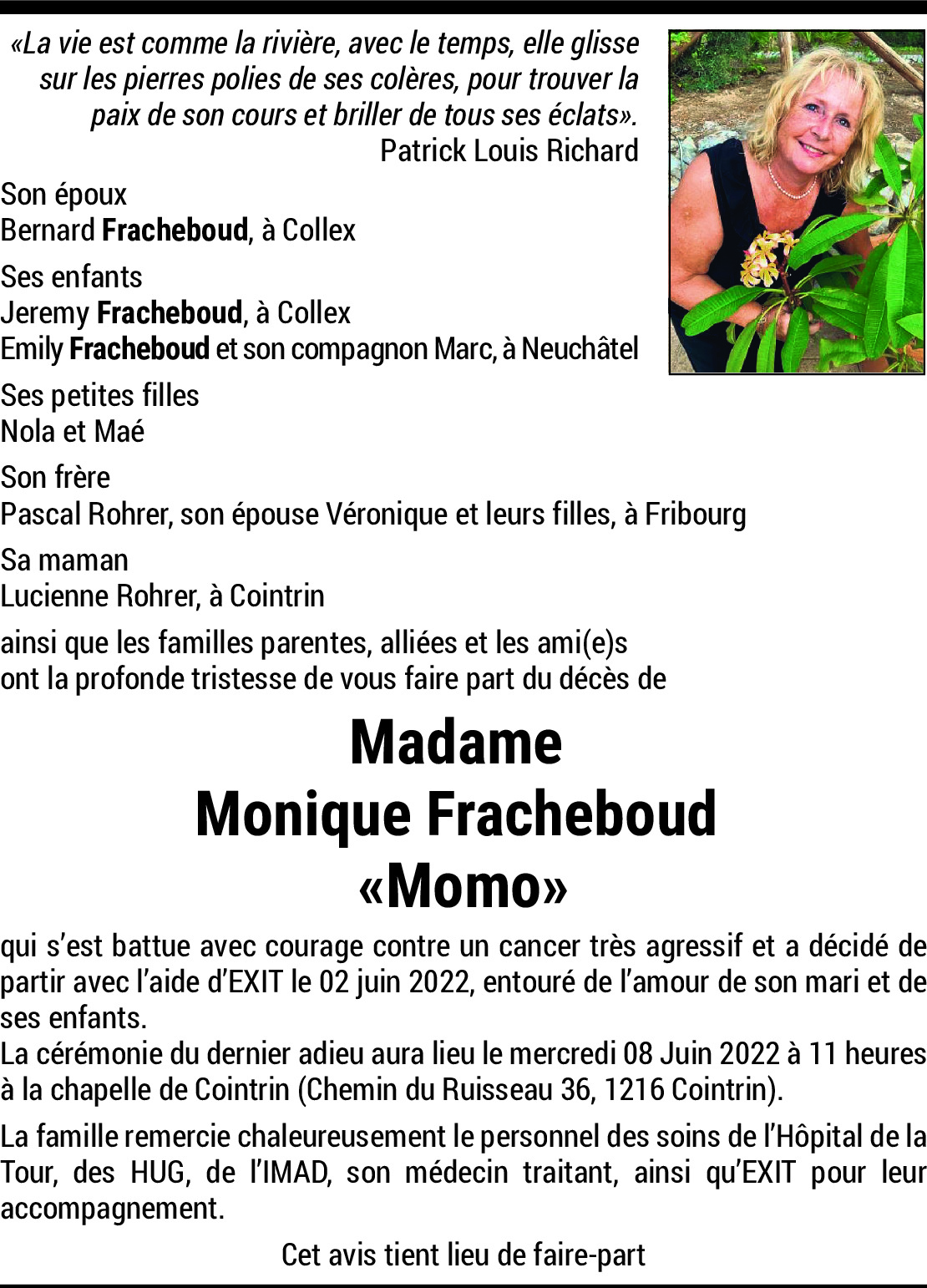 07.06.2022 Melden Le décès d’un être aimé est toujours un déchirement. Je partage ta peine et suis de tout cœur avec toi pendant ce moment douloureux. Mes sincères condoléances et ma profonde sympathie. P. Miazza Von Miazza