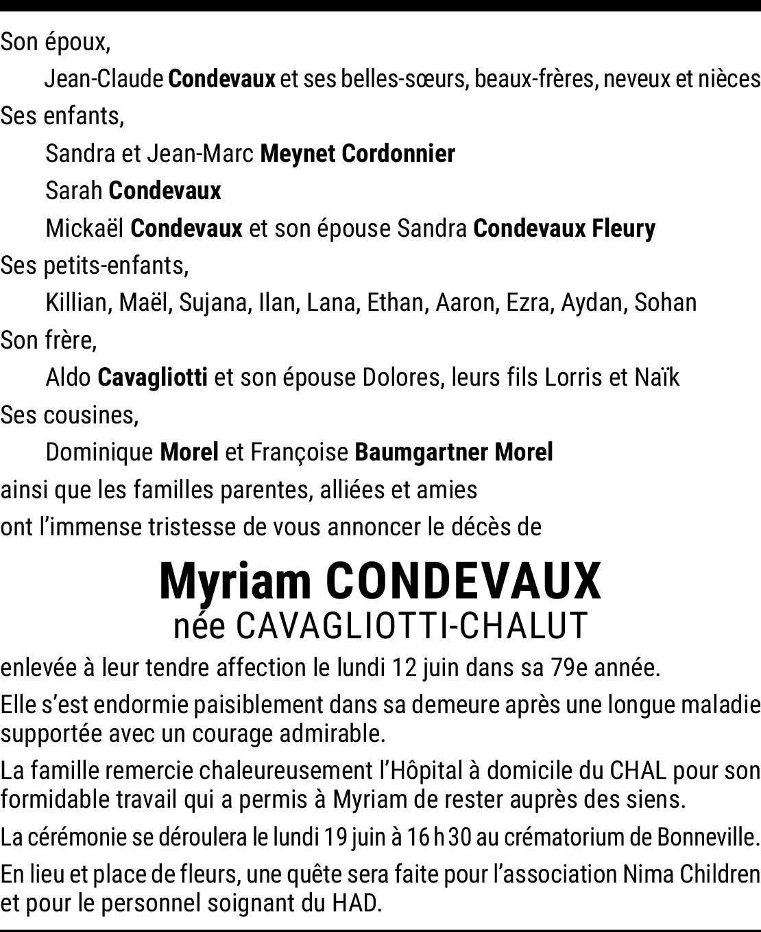 Myriam, ayant eu l'honneur de te connaître quand nos enfants étaient à l'école du Château, je regrette infiniment ta disparition. Je t'ai toujours considérée comme une personne courageuse et de fort caractère, ce que tu as bien prouvé tout au long de ta cruelle maladie.