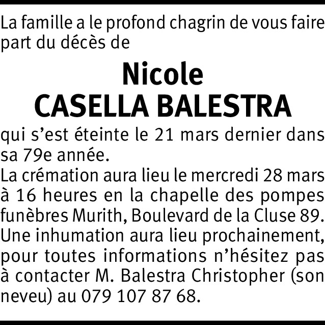 Chère Nicole, Nous sommes très émus et reconnaissants pour ton immense courage et la confiance que tu nous as témoignée en nous tenant toujours informés. Tu nous as quittés si rapidement que c’est avec d’autant plus d’émotion que nous tenons à te remercier pour ces nombreuses années d’amitié partagées. Tu nous manqueras beaucoup et, malgré notre immense tristesse, nous garderons toujours dans nos cœurs le souvenir des bons moments passés dans la bonne humeur grâce à ton sympathique caractère enjoué ! Ciao Nicole ! Avec nos meilleures messages et sincères condoléances à sa famille ainsi qu’à ses amis dont elle parlait avec tant de sentiments ! Suzanne et Gaston [email protected]