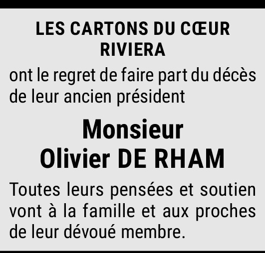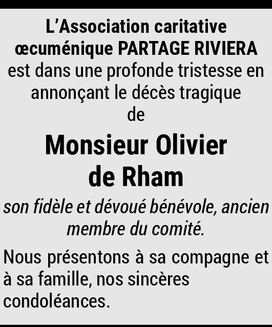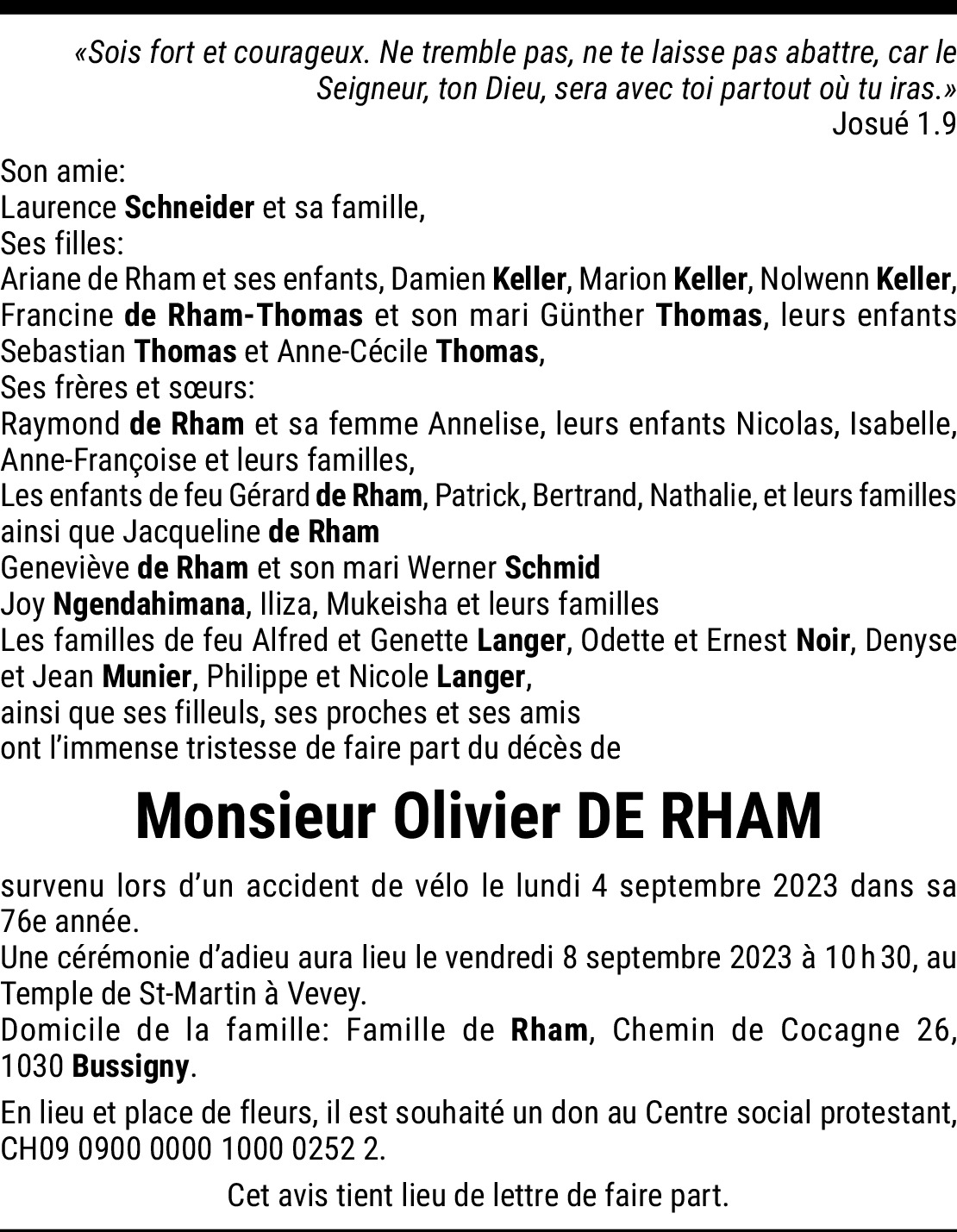 A toute la Famille de Olivier de Rham, je présente mes sincères condoléances, suite au tragique décès d'Olivier. Je garderai le meilleur des souvenirs de votre Papa, Grand-papa, parent et Ami.