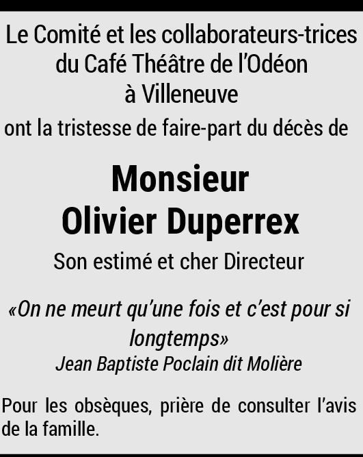 Ce départ de Olivier nous prive d'un homme de talent, apprécié de toute la région veveysane.