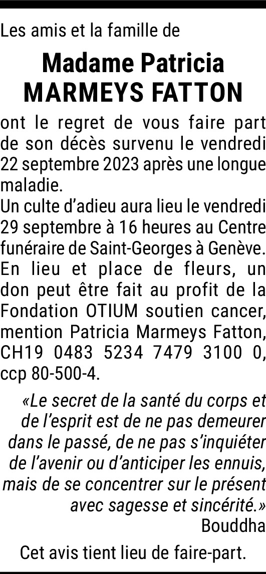27.09.2023 Melden Patricia était-elle la fille de Georges Marmeys et Jacqueline Marmeys, née Hirschy ? J'étais leur amie d'enfance et d'adolescence... Terrible de perdre son enfant ! De tout coeur avec vous Von Budry