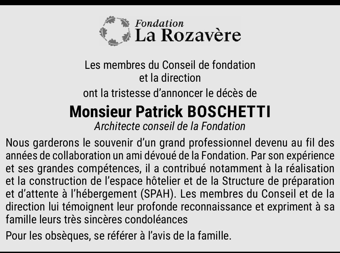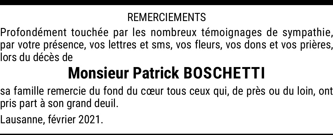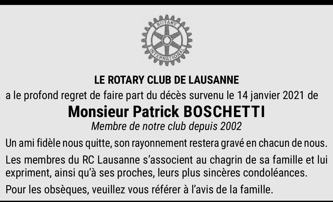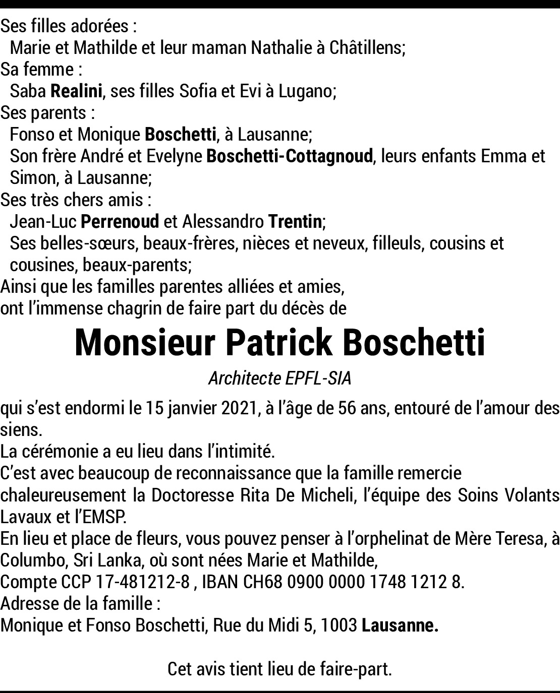 Patrick, Après plus de 40 ans sans se voir, vers la fin de l'été 2020, tu as eu la bonne idée de contacter quelques-uns de tes amis de Maya-Joie, l'école de ton adolescence à La Fouly. J'ai la chance de faire partie de ceux-ci et on a décidé se se revoir le temps d'un repas au restaurant vers la fin 2020. J'ai été heureux de retrouver et re-découvrir un ami, une chouette personne, intéressante et pleine de sagesse. Tu m'as raconté quelques moments de ta vie et tes déboires santé. On s'est remémoré quelques aventures de Maya-Joie, sans oublier les bêtises qui ont fait le sel de notre adolescence. Tu nous avais contacté pour qu'on se revoie avec Marc et Juan, pour recoller le puzzle de nos histoires vécues dans ce petit coin de paradis. Malheureusement, cela ne se fera jamais. Mais nous nous rencontrerons quand même, Juan, Marc et moi en ton honneur, car sans toi, on aurait certainement jamais été remis en contact. Et on pensera à ces beaux moments vécus avec toi et buvant un verre en ton honneur. Je te souhaite un bon voyage vers l'autre monde et je pense bien fort à tes proches et tes amis en leur adressant mes profondes condoléances