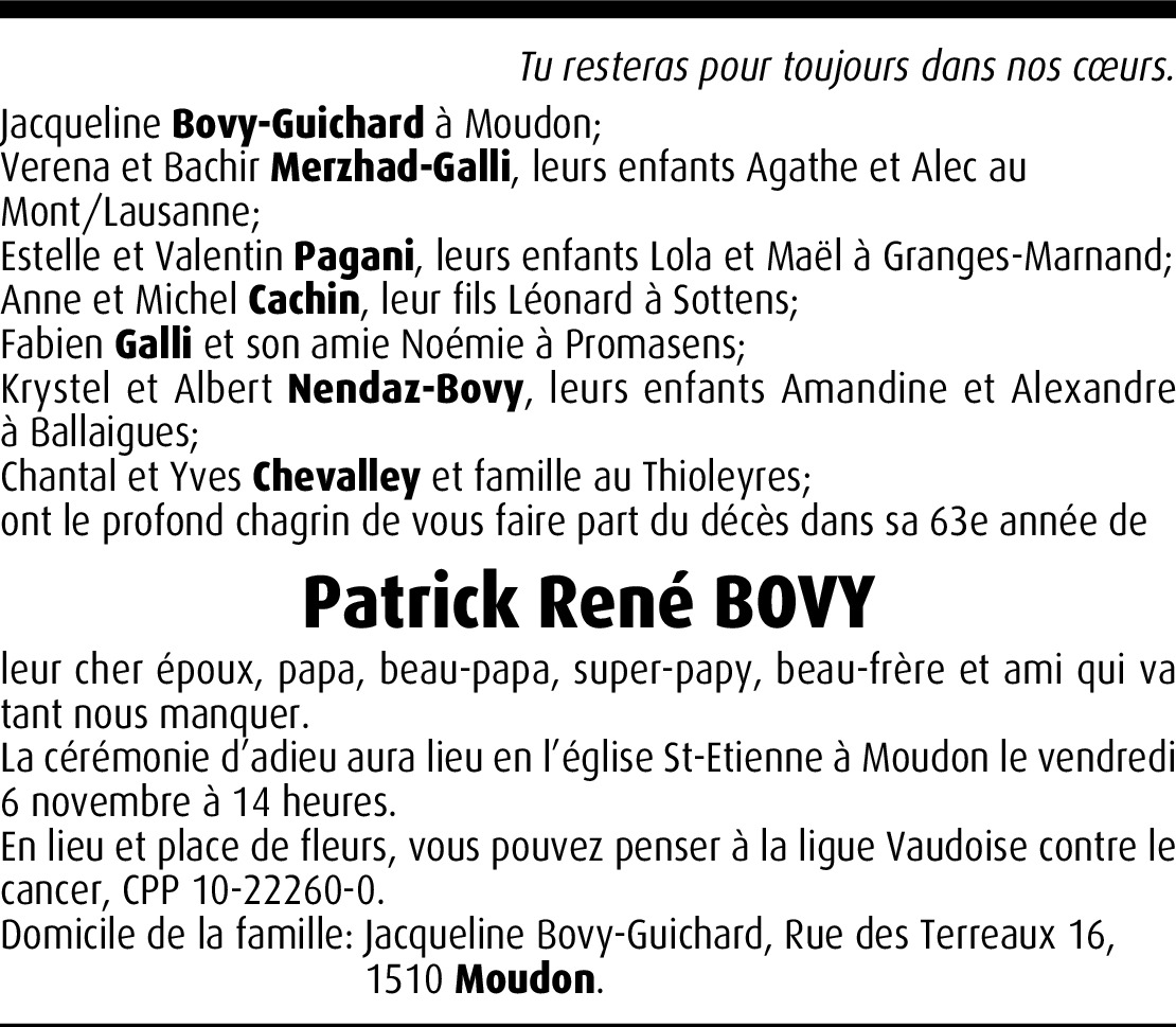 Vor mehr als 4 Jahren Melden Patrick a été très apprécié dans nos relations pour son côté humain, nous vous adressons chère famille tous nos condoléances. Marlène Curtet et François Légeret. Von Marlène Curtet