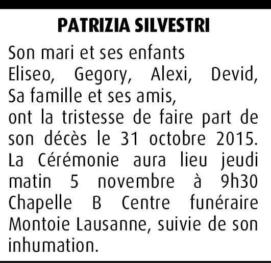 Patrizia, la vie ne t'a pas épargné. Tes souffrances ont été nombreuses. Mais tu as aussi eu le bonheur d'avoir un mari plein d'amour et des enfants admirables. Je garde de toi le souvenir d'une amie généreuse et attentionnée.
