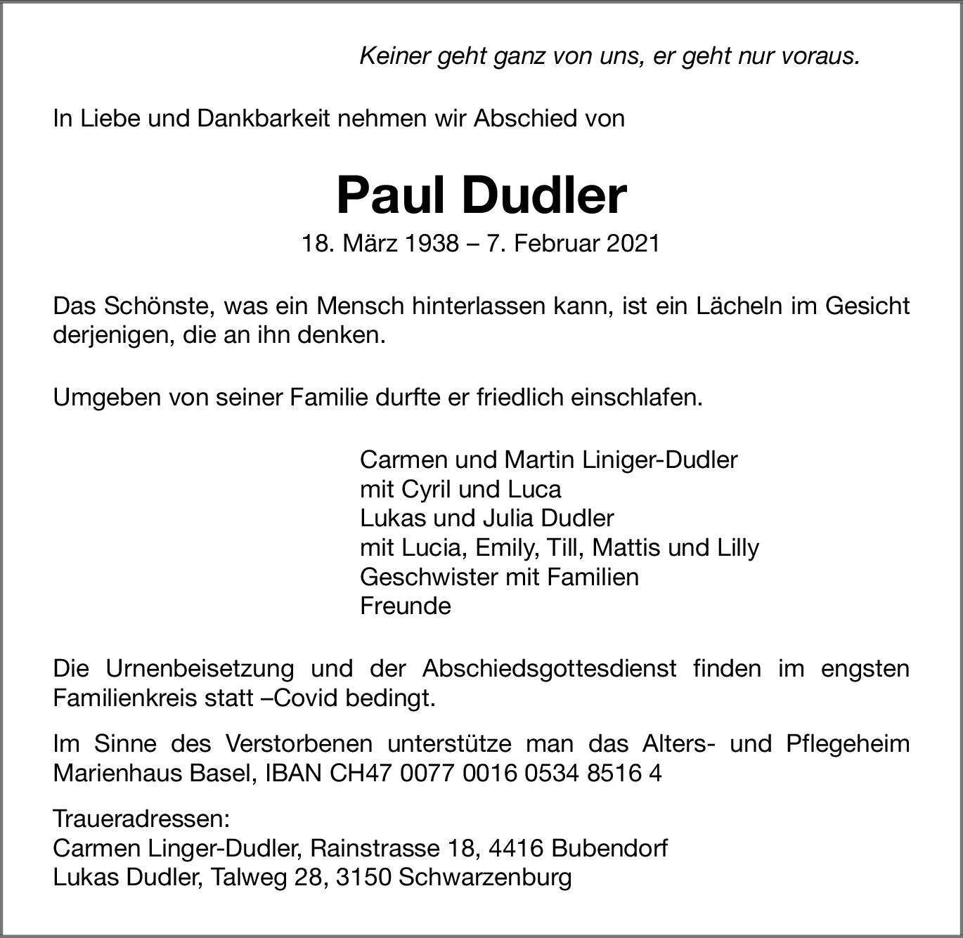 Möchten Sie über neue Todesanzeigen und Kondolenzen für diesen Verstorbenen informiert werden?