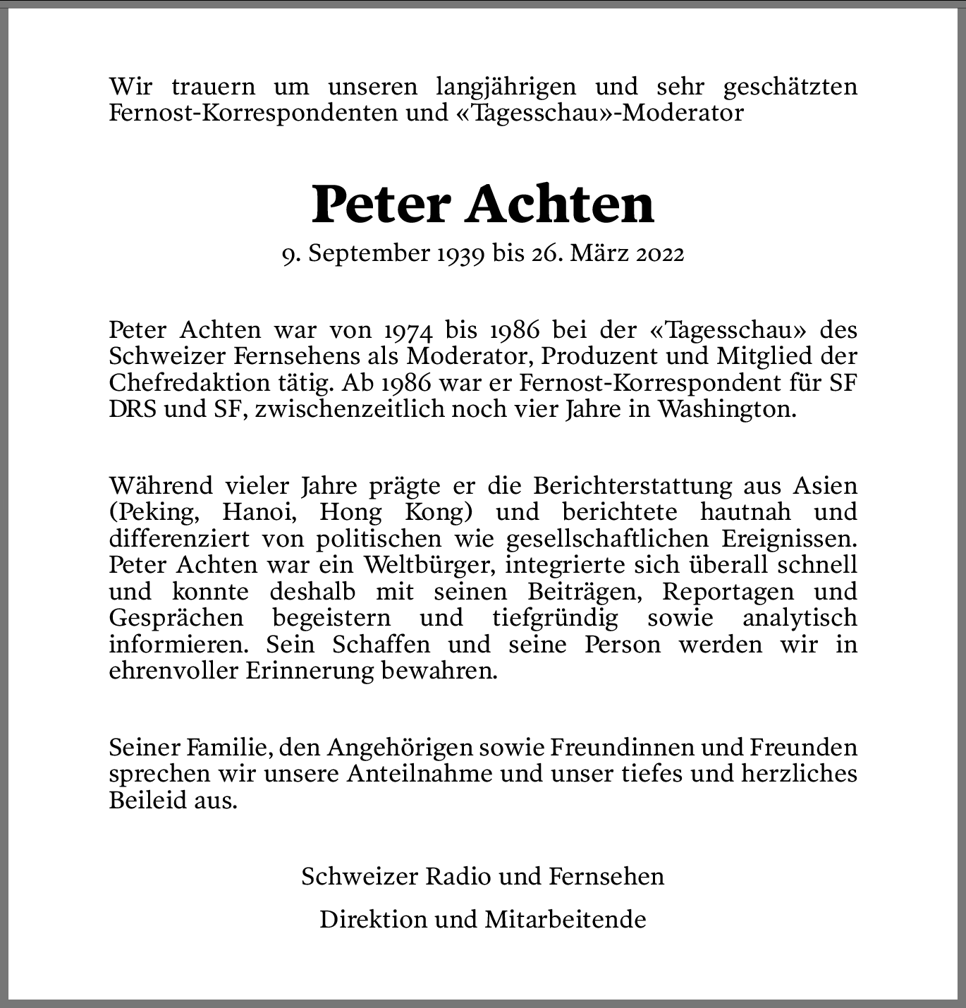 Möchten Sie über neue Todesanzeigen und Kondolenzen für diesen Verstorbenen informiert werden?