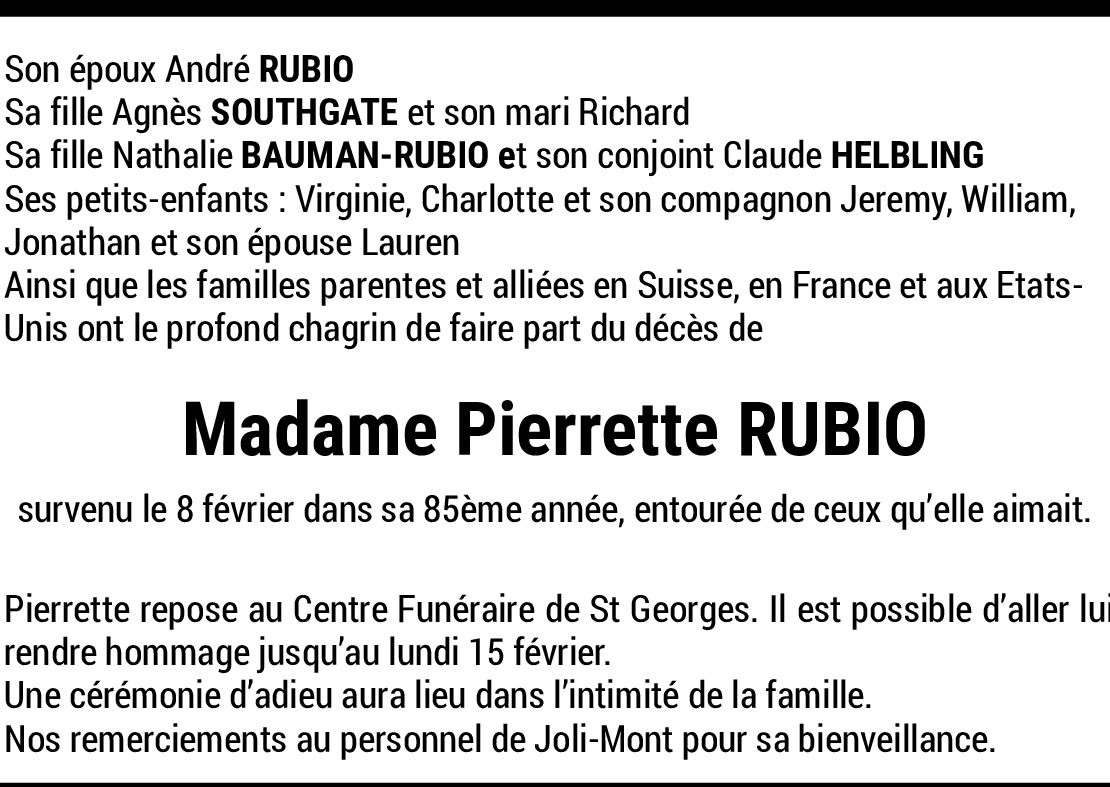 Je viens de rédiger un message, concernant le décès de Mme Pierrette Rubio, alors que j'ai mis le nom de son époux, André. MERCI de rectifier. Michel Favre, 3 pl. des Aviateurs - 1228 Plam-les-Ouates