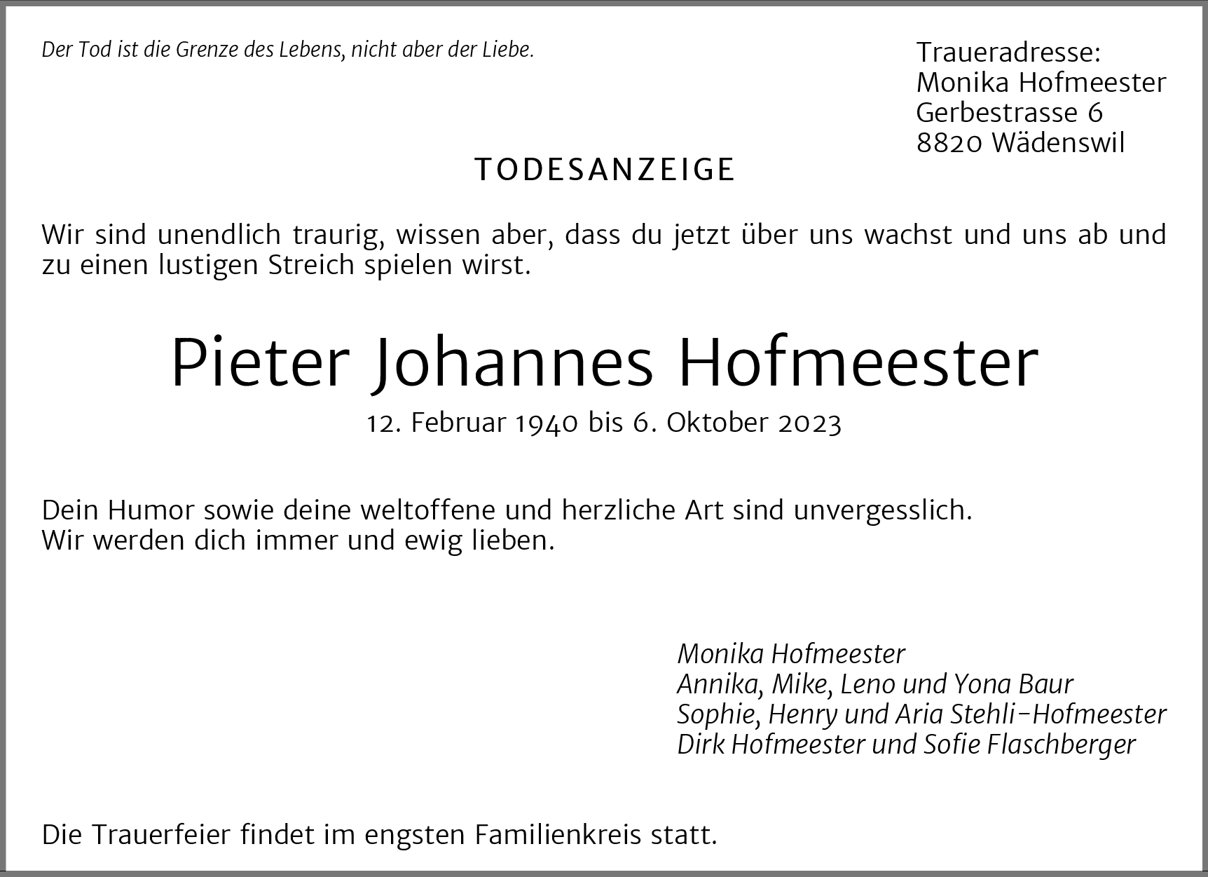 Möchten Sie über neue Todesanzeigen und Kondolenzen für diesen Verstorbenen informiert werden?