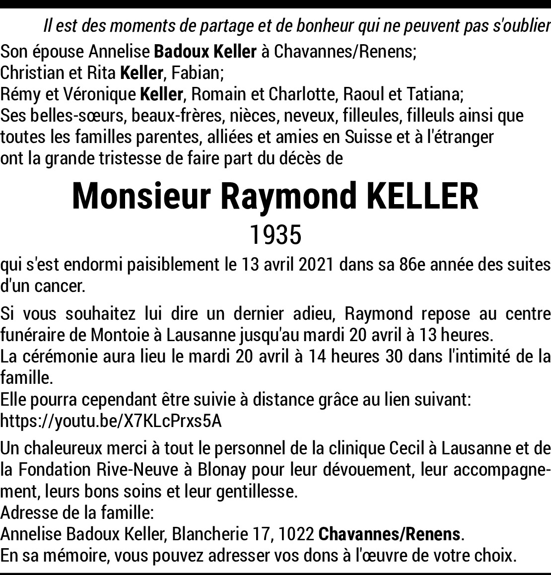 Chère madame, hier j’ai appris avec grande tristesse la mort de Raymond. Depuis gamin, alors qu’il était à Bussigny avec son frère, j’ai suivi sa belle carrière en motocross et l’ai connu depuis ce moment-là. Je garderai de lui le souvenir d’un homme ouvert et sympathique.