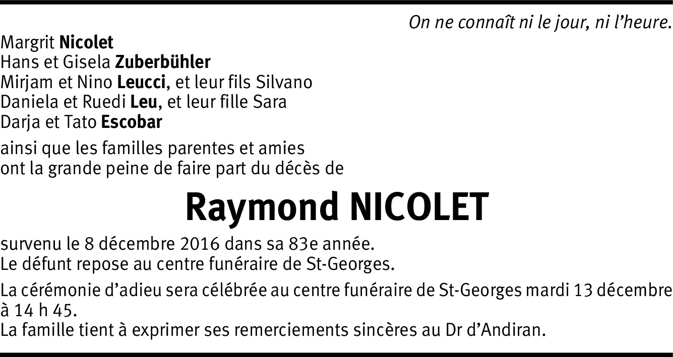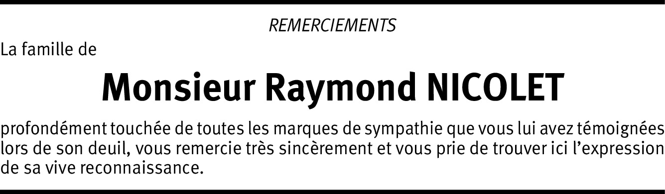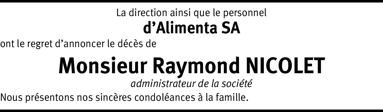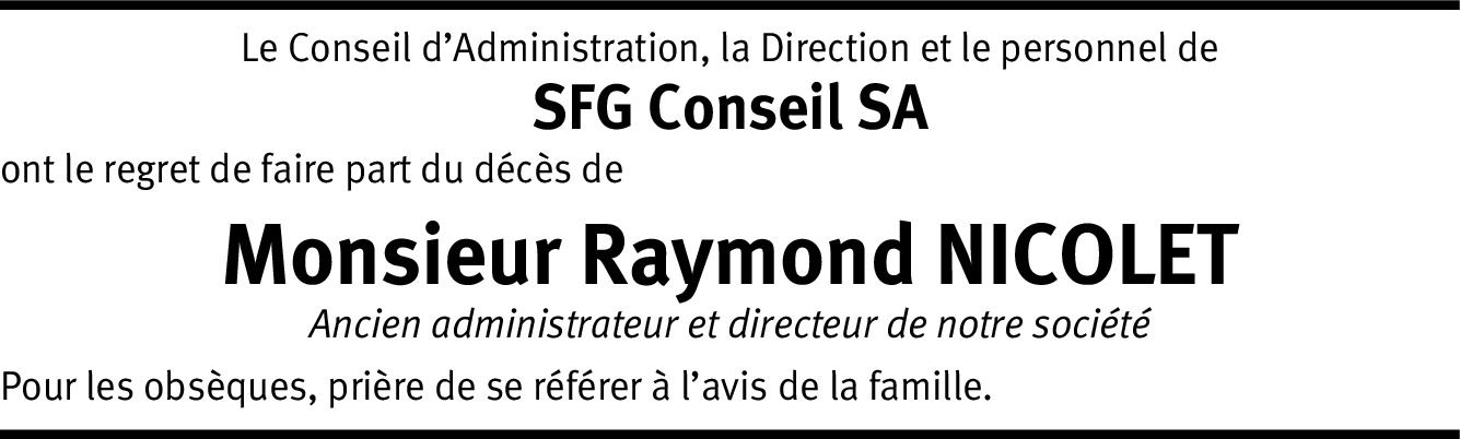 Ayant collaboré pendant de nombreuses années (1974-2010) avec Monsieur Raymond Nicolet au sein de la SFG SA, c'est avec beaucoup d'émotion et de tristesse que j'ai appris sa disparition Je vous assure de mon entière sympathie en cette douloureuse épreuve et vous présente mes sincères condoléances Veuillez croire, Chère Madame, à l'assurance de mes sentiments distingués. Joëlle Croset