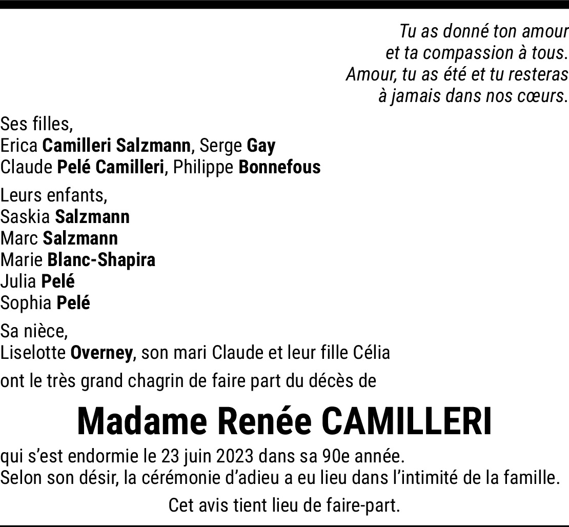 Adieu ma Cousine, De toi je garde un sourire toujours présent. Une mise irréprochable, un port de reine et l'allure d'une petite femme gaie, élégante et distinguée. Tu es partie tout doucement, discrètement. Pour un peu nous ne l'aurions pas su. Comme ta mère. Comme elle tu étais déjà entrée dans les ténèbres avec une vue défaillante. C'est fini Renée. Tu reposes. Avec les tiens, loin des souffrances et des peurs. Sois en paix. Ta famille de Domdidier et des Etats-Unis ont une douce pensée pour toi. Nina Brissot