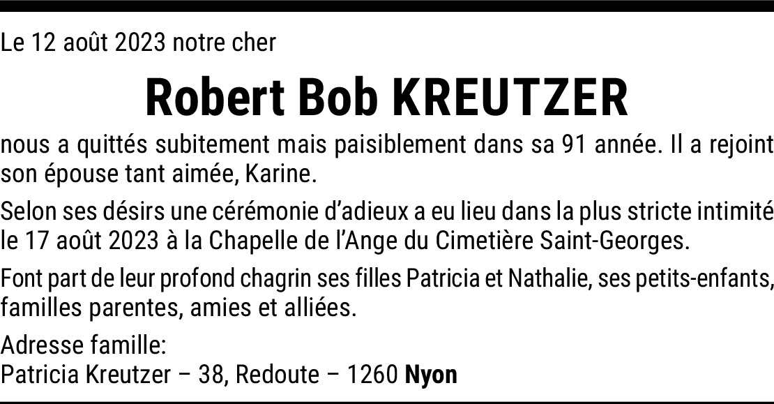 26.08.2023 Melden En lisant la tribune je vois que BOB s'en est allé. Recevez, mes pensées attristées. Pas de nouvelles de ma part, mon mari ayant été hospitalisé près d'une année et maintenant c'est moi depuis 6 semaines et j'en ai encore pour 2 mois. Josiane. Von Kursner