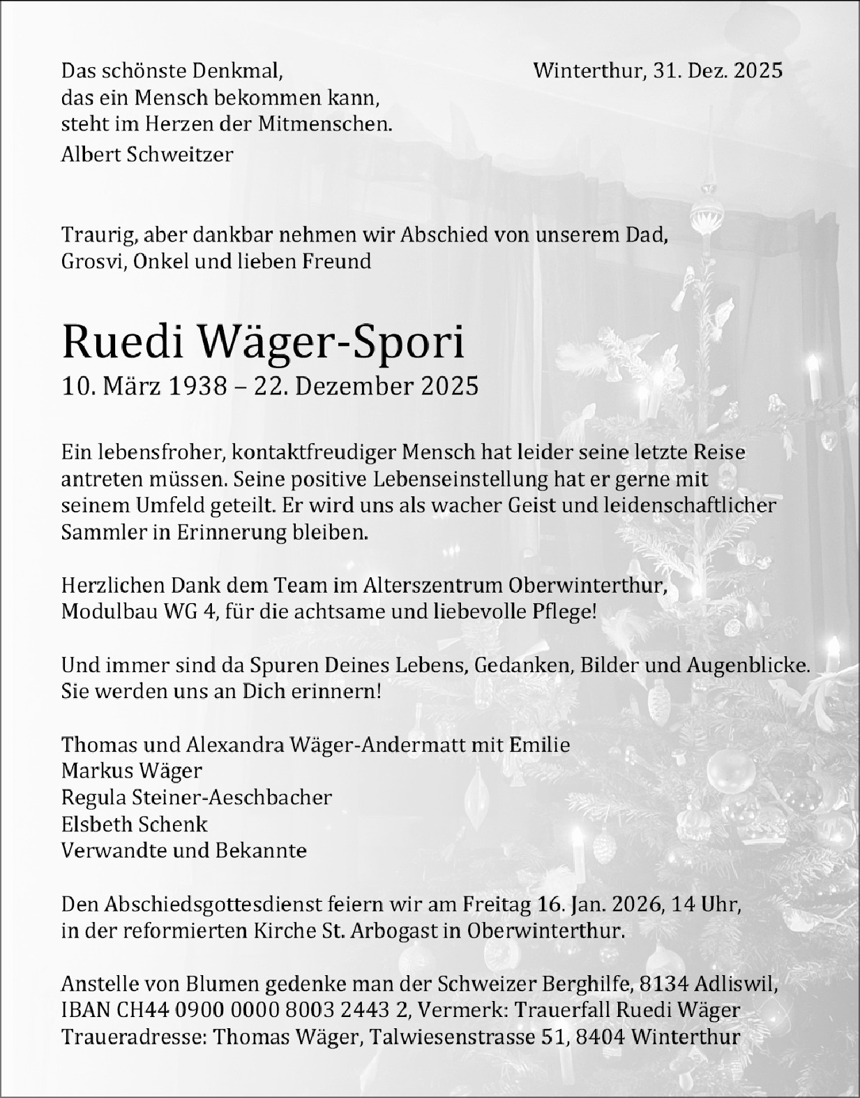 Ein guter, langjähriger Freund ! 31.12.2025 Melden Wir werden unseren Ruedi immer in guter Erinnerung behalten und danken herzlich für diese langjährige Freundschaft. Du fehlst auch uns! Herbert und Anita Von Ittner Herbert und Anita