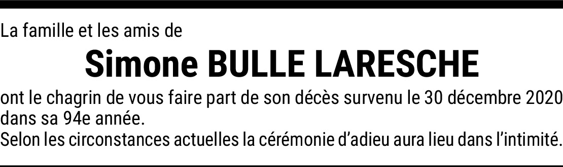 La mémoire de Madame Bulle-Laresche remonte à août 1971, où arrivée à Neuchâtel, enfant, sans aucune connaissance linguistique du français, elle m'a fait passer les tests pour une éventuelle admission à l'école secondaire (ESRN). Sa bienveillance m'a accompagnée jusqu'au gymnase et je garderai d'elle le souvenir lumineux d'une intelligence remarquable et d'une humanité sans faille. Combien aurais-je désiré vous dire que dans cette enfance de pensionnat, vous avez été un rayon de soleil.