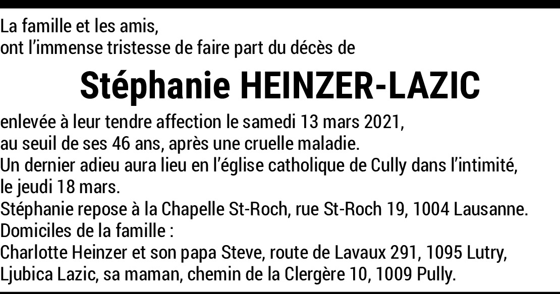 Vor mehr als 4 Jahren Melden Stephanie, tu vas me manquer, tu me manques déjà. Quel choc d’apprendre ton décès. Je présente à Charlotte, ta fille, et à ta maman mes plus sincères condoléances. Von Valdinéia Noémie Kart-Favre