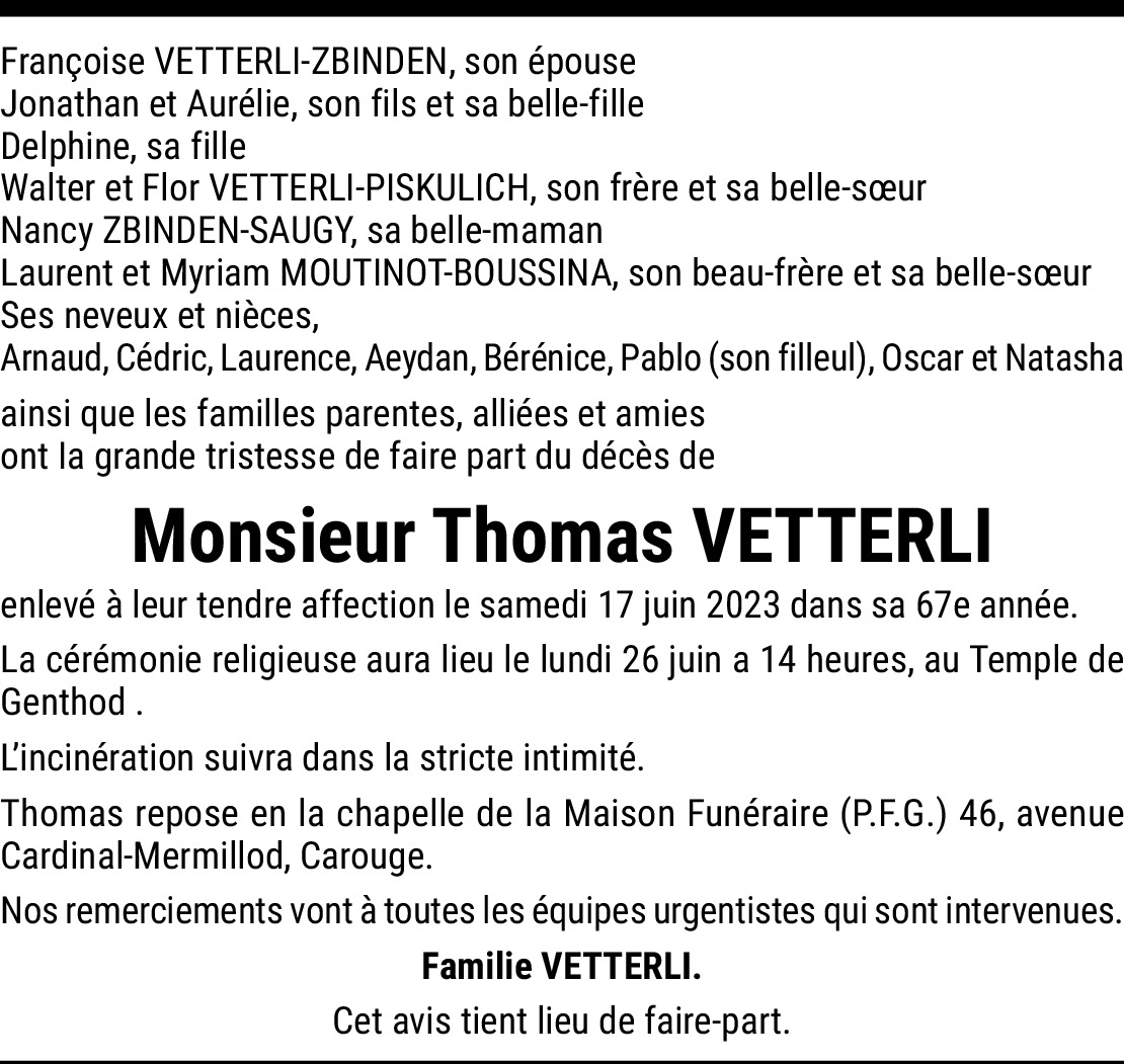 25.06.2023 Melden Toute mes condoléances à la famille, ma fille Yohanny Carrasco a fait son apprentissage avec monsieur VETTERLI. Avec une immense tristesse j’apprends cette mauvaise nouvelle Von Muller