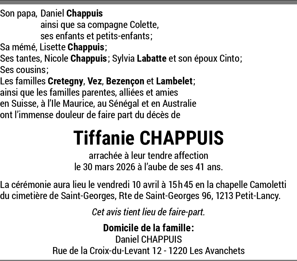 C’ est avec une enorme tristesse que nous avons reçû l’ avis de décès de Tiffanie.