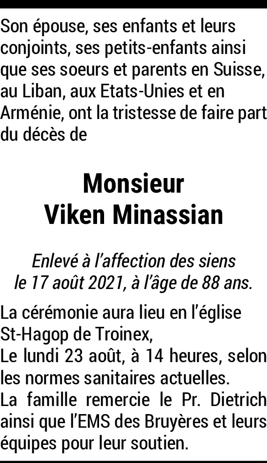 22.08.2021 Melden Chère famille, Vigo va beaucoup me manquer. Il a contribué fortement et depuis mon enfance, à “mon capital” joie et affection. Il a été et sera toujours, l’exemple le plus élevé de la dignité d’un homme. Lila (Lilouch ou Jannes pour lui). Von Kasparian