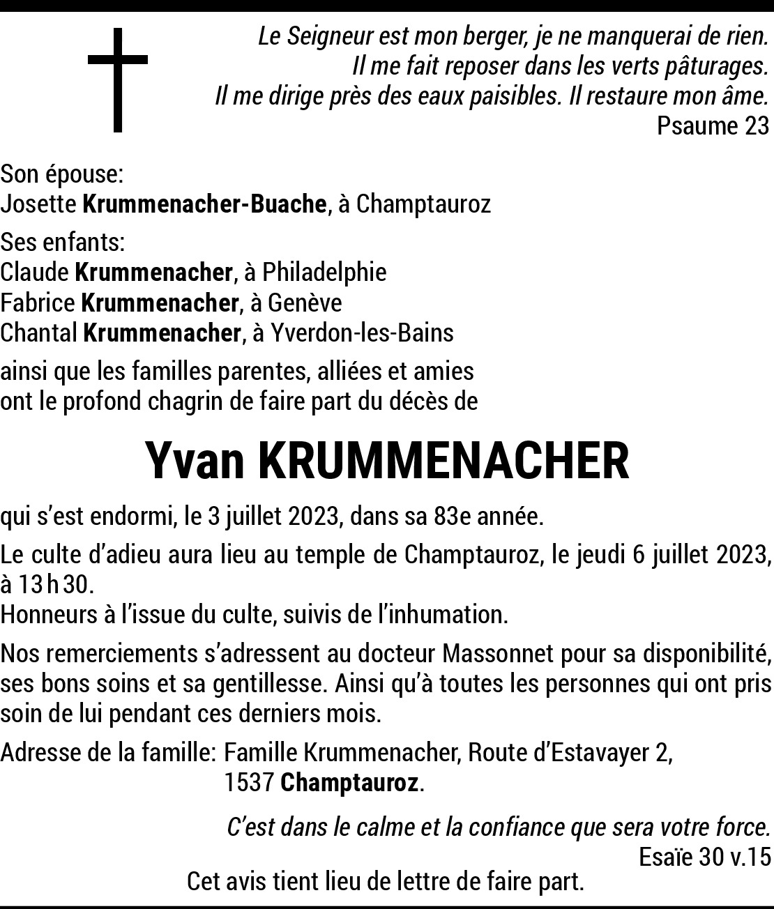 05.07.2023 Melden La famille Cunha-Jardim on une pensée pour ton âme, repose en paix Yvan. Toutes nos condoléances mes chères voisins. Von Krummenacher